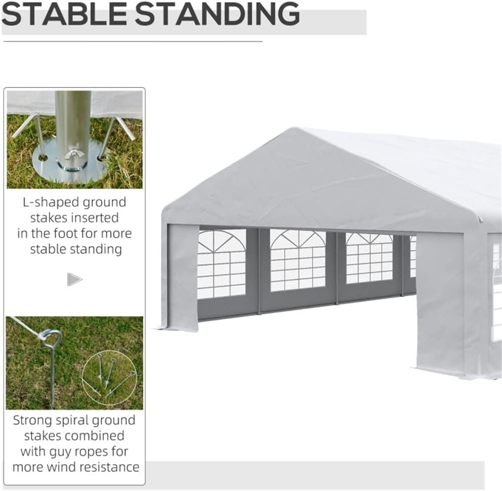 - Car Port & Party Canopy: Featuring ample space no matter what your needs, this extra-large party tent offers you options. Place it outside as an area for wedding receptions, graduation parties, or an extra-big business barbeque. It can hold up to 85 guests, an amazingly large amount of space. Use it to keep your cars dry when you keep several luxury vehicles safe and protected outdoors.- Side Panels, Windows & Doors: Two sidewalls provide an easy way to give your shelter privacy, a more formal appearance for events, and additional weather protection. Twelve cathedral-style windows let you enjoy natural light with protection from the wind. the two zipper doors to enjoy the breeze and for quick entry.- UV Protective Party Tent Top: When you're planning a wedding, picnic, or graduation, no wants a sunburn as a party favor, and a trophy car with a ruined paint job is just a car. Our PE tent top provides a safe, shaded space to protect cars, partygoers, or outdoor furniture underneath, without wearing out under UV, even at the peak of .- Party On: Keep your outdoor party up and active. Our outdoor party tent features a galvanized steel frame that was carefully selected to withstand water and warping and multiple reinforcing rods. Also included is a set of guy ropes and ground stakes intended to help hold up its structure overall.- Outdoor Event Tent Canopy Info: Overall Dimensions: 39.2' L x 22.8' W x 10.8' H. Eaves Height: 6.6' H. Assembly required. We advise customers never leave the canopy overnight or under bad weather conditions.Specification:- Color: Wedding White- Material: Steel, PE, PVC- Overall Dimensions: 39.2' L x 22.8' W x 10.8' H- Eaves Height: 6.6' H- Door Size: 18.4' W x 6.1' H- Window Size: 4.7' W x 4.1' H- Sidewall Size: 39.1' W x 6.9' H (right/left)- Windproof Level: 4- Snow Load Capacity: 1.1 lbs. / sqft