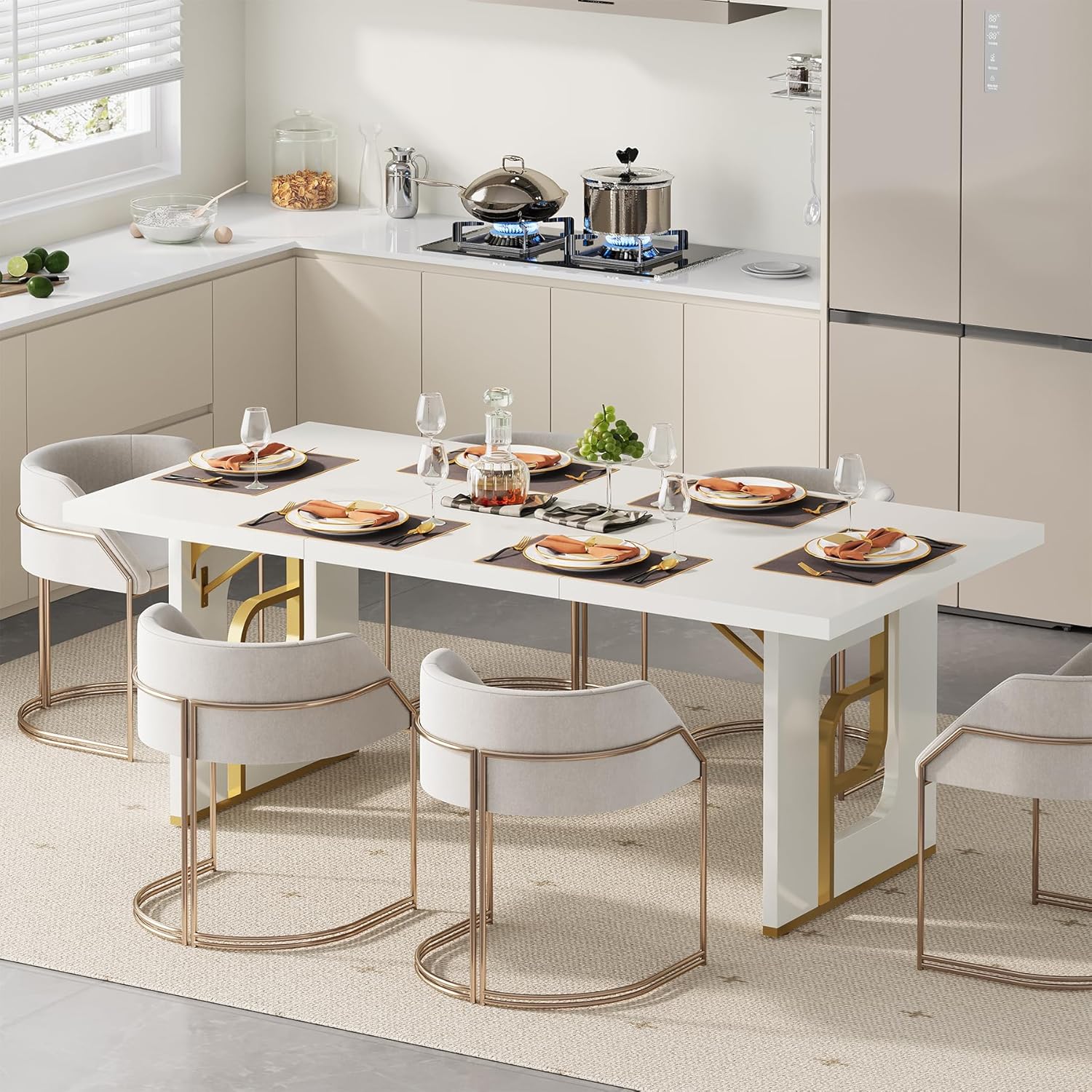 71'' Large Dining Table for 6 to 8 People, Modern Rectangular Kitchen Table, Dinner Table Furniture with Metal Legs for Dining Room, Living Room, Banquet, Home, Beige and Gold