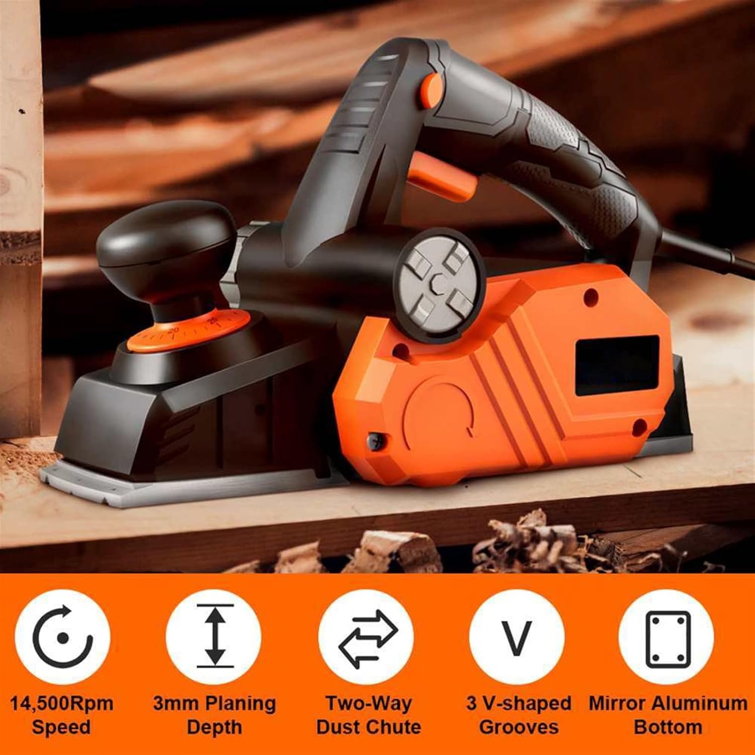 Package Included:1x 7.5-Amp Electric Hand Planer1x Packaging Box1x ManualEU Plug:Rated Voltage/Frequency: 220V/50HzRated Input Power: 900WNo-load Speed: 14500rpm/minPlaning Width: Max 82 mm(3-1/8")Planing Depth: 3mm(1/16")Shiplapping Depth: 24 mmUS Plug:Rated Voltage/Frequency: 120V/60HzRated Input Power: 7.5ANo-load Speed: 14500rpm/minPlaning Width: Max 82 mm(3-1/8")Planing Depth: 3mm(1/16")Shiplapping Depth 24 mmMain Features:7.5-Amp High Efficiency MotorGenerates up to 14,500rpm for fast stock removal and smooth finishes.Adjust planing width and precise positioning with the parallel guide.Precise and Smooth ProcessingDual Side Dust OutletEjects shavings on left or right side to accommodate your preference.Keep Clean and Sawdust FreeConnecting Dust Bag and connecting vacuum cleaner.All-Mirror Aluminum BottomEnhance flatness of your workpiece.3 V-shaped GroovesDesign angled chamfer along the edges of wood in different sizes.Spring Bracket for ProtectionElevate planer and protect blade and tool resting spot.Note:1.Please allow 1-3cm error due to manual measurement. Please make sure you do not mind before you bid.2.We have been constantly improving the effects of photography, but due to different camera and monitor parameters, lighting and other factors, it is still difficult to avoid the color difference between the real object and the photo, so please refer to the actual color.Lightweight electric planer for efficient and smooth woodworking surfaces. Adjustable depth, comfortable handle. Ideal for finishing, making furniture and other woodworking projects. Portable and easy to use, fine planing.