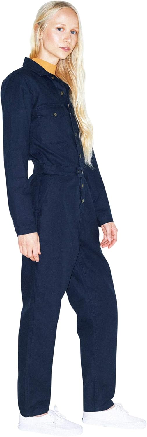 Work wear inspired coverall featuring button up, two front chest pockets and a tab button closure at waist. Fit is slim and coverall is made from a 100% cotton twill that has a more structured feel. Machine wash cold or dry clean. Do not bleach. Tumble dry low. Cool iron. American Apparel is an iconic brand with a unique history and distinct culture that has gained a fiercely loyal customer following and tremendous Global brand awareness. We operate at the intersection of style, integrity, and ethics from start to finish.