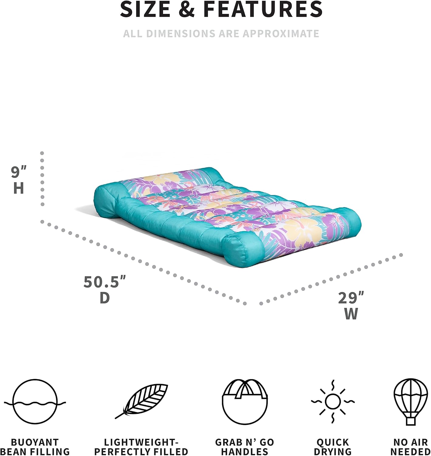 Unwind and relax with the Big Joe Kona Pool Float. Bid farewell to ordinary inflatables and embrace the comfort of an integrated head pillow, perfect for drifting off to the soothing sounds of summer. Enjoy the perfect float in style with bean filling and trendy fabrics. When it's time to go, simply fold and carry using the convenient handles. Quick-drying mesh fabric in vibrant prints ensures easy portability. Designed for teens and adults, dimensions are 31"W x 67"D x 8"H, and it weighs 3.95 lb.