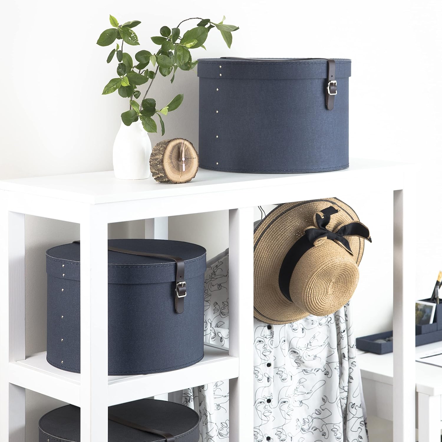 Store various items safely as well as stylishly - with the storage box with lid set of 2 from Bigso Box of Sweden This stylish two-piece storage box set from Bigso Box of Sweden is suitable for storing various items such as clothes, accessories, hats, shoes, etc. The lid protects the stored contents safely from dust and dirt and also enables discreet storage. The robust and sustainably manufactured home organisation is made of recycled fibreboard, coated with paper made from ECF cellulose for a stylish linen look. The high-quality leather strap not only rounds off the attractive appearance of the storage box but also allows it to be firmly closed when needed. The product features in detail: Large and small storage box for clothes, hats etc. Set of 2 With lid for safe and discreet storage In linen look and with leather straps Material: Fibreboard and paper Colour: Blue Dimensions: 37.5 cm in diameter x 23.5 cm in height and 35.5 cm in diameter x 23.5 cm in height Model number: 5482C6449LEA648