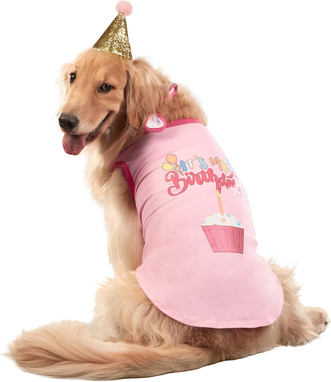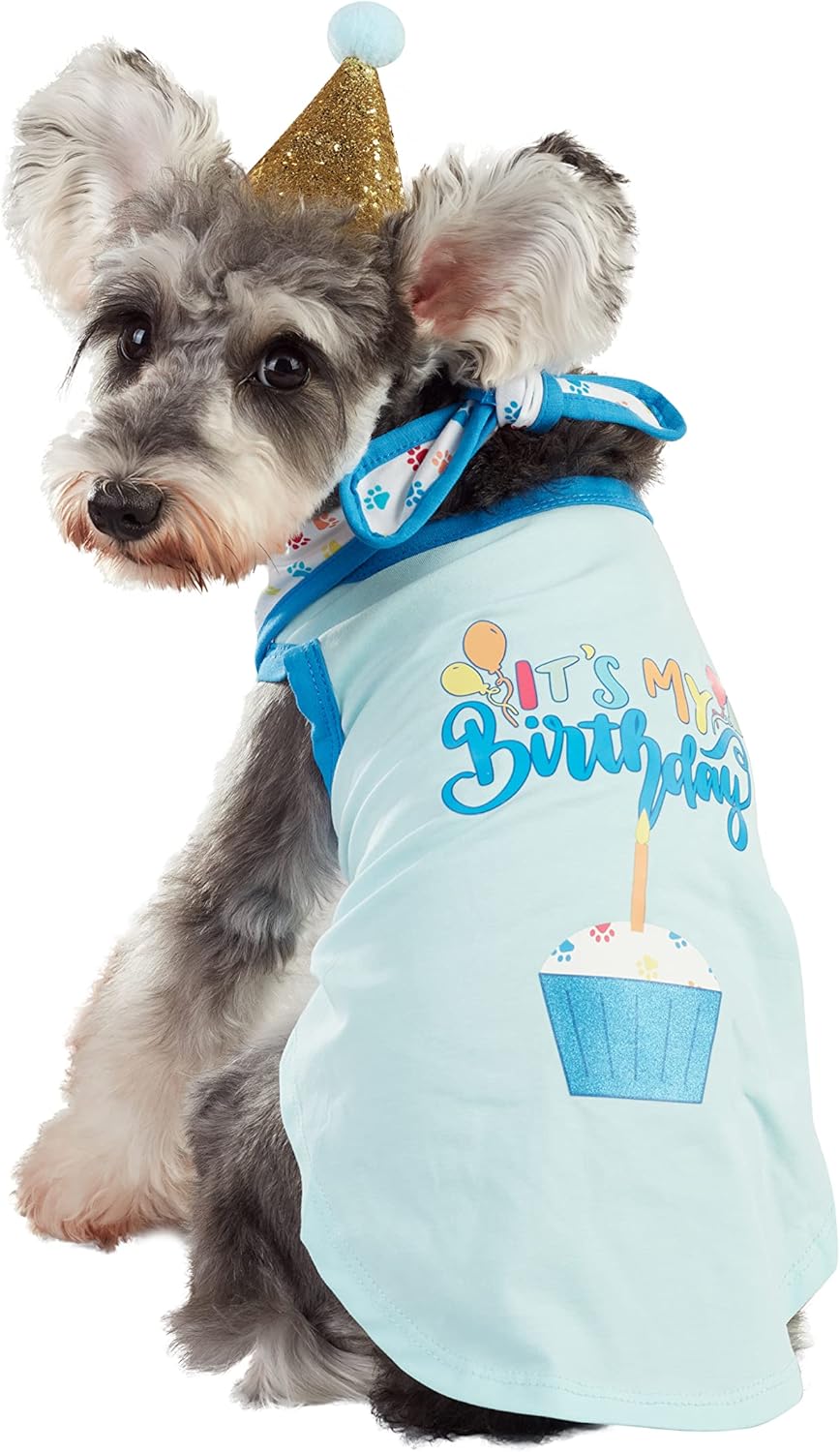 Another year! Another milestone! Celebrate your fluffy pal's big day with this Birthday Boy Party Set! This set comes with a colorful polka dot bandana, a gold-sequined party hat, a blue cupcake toy, and a cotton blend blue top in a pullover style for easy on and off!