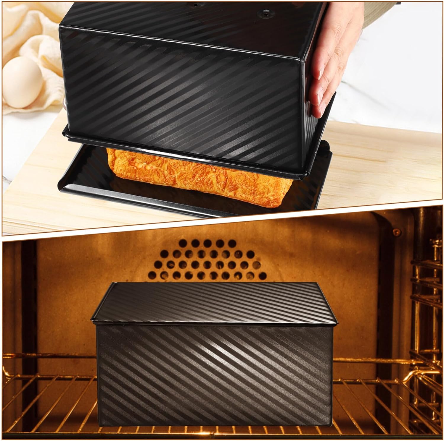 DescriptionThis bread pan with lid is designed to help you bake the great loaf bread every time. With its non-stick surface and rectangular , it's suitable for baking both bread and toast.Features-Color:Black-Material:Carbon steel- Size: 21.50X12.00X11.00cm/8.45X4.72X4.32in Package Including1 x bead pan with lid3 x scrapers