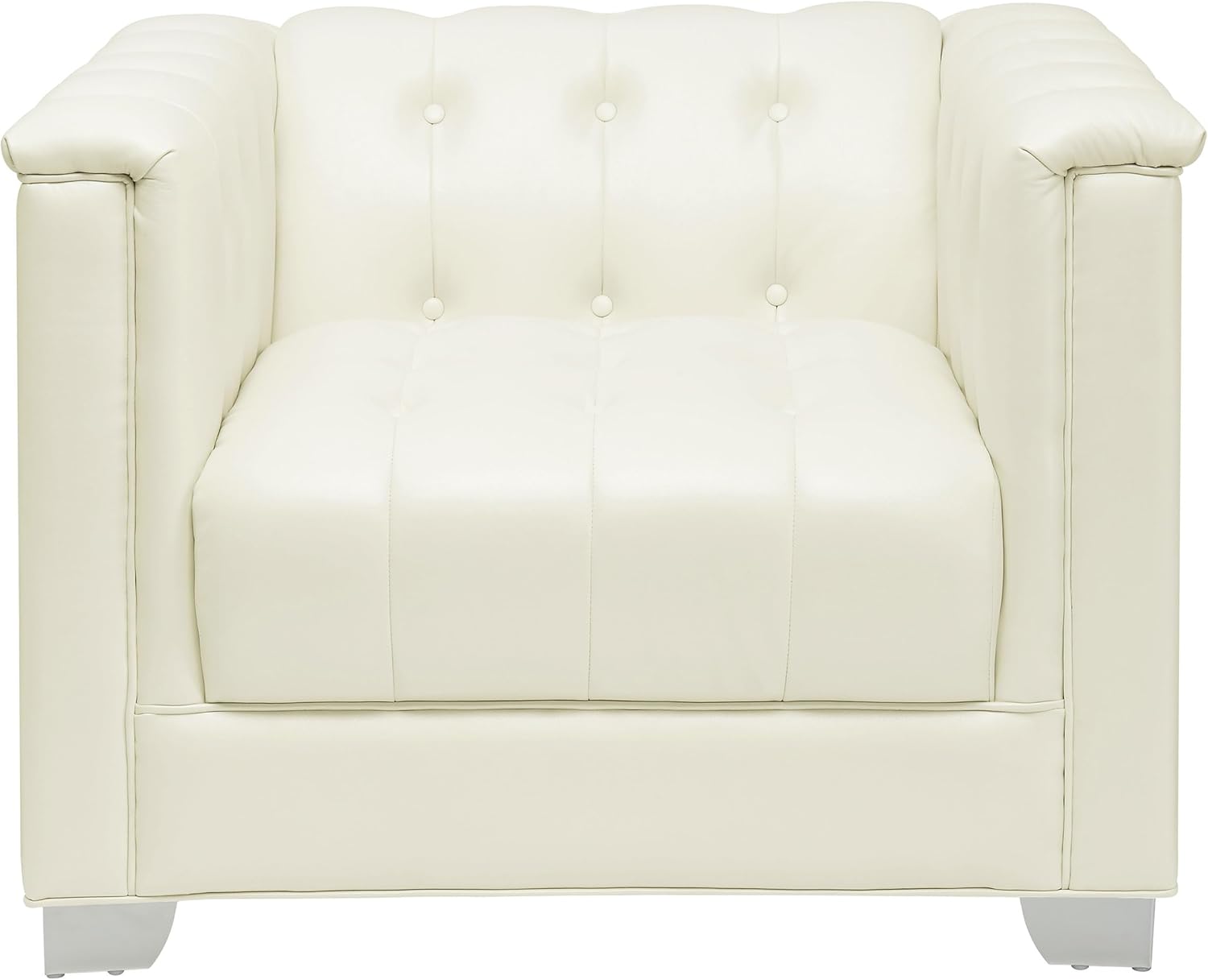 This white faux leather chair brings modern elegance to any space with crisp white upholstery, sculpted track arms, and timeless button tufted detail. Crafted with supportive foam cushioning, a firm tight back, and a luxuriously padded seat, it offers the perfect balance of comfort and style. Refined chrome legs, bold door knocker handles, and sturdy wood and metal construction enhance the drama of this accent chair with arms. A statement upholstered accent chair designed for curated home furnishing, this piece blends glamour and function in the perfect centerpiece for the living room or any polished home furniture layout. Dimensions: Chair Seat Dimensions: 19 inches high x 26 inches wide x 24 inches deep