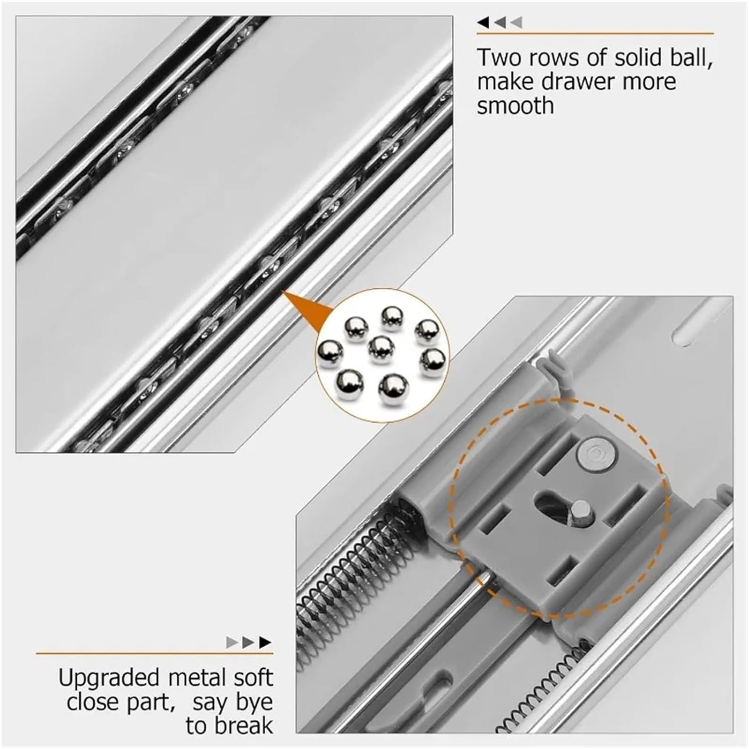 1. Easy to take down and clean,good load-bearing capacity, no shaking, and durable2. Feature a fold full extension design, enabling them to fully open for easy access3. With multiple fixed hole positions for easy installation and adjustmentSpecifications:Product Name: Drawer Slides Home Kitchen CabinetsMaterial: Bearing SteelLength: 550mmWidth: 45mmThickness: 12.7mmDescription:Soft closing: The drawer slide is equipped with a hydraulic damper to achieve a soft closing effect. The double spring design makes less noise when opening and closing, creating a warm and quiet home environment for you.Material: The drawer slide is made of cold-rolled steel with a galvanized surface, which is and has a strong load-bearing capacity. Solid ball bearings ensure smooth switching and long service life.Double anti-fall: The soft closing drawer slide has a double anti-fall function to the drawer from separating from the cabinet. Easy to disassemble and clean.Packing list:10Pairs 22 Inch Drawer Slides