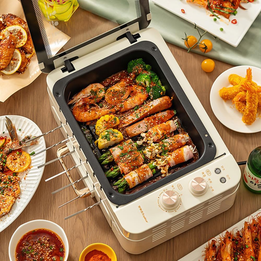 Electric Indoor Grill Electric Shish Kabob Skewer Elevate your indoor cooking game with the 1000W Smokeless Indoor Gril, enjoy indoor grilling with minimal smoke. Advanced temperature control, making it perfect for everything from sizzling steaks to fluffy pancakes. Enjoy the pleasure of grilling without the smoke and hassle, and experience delicious, perfectly cooked meals every time. Electric Grill or Griddle Intended Use: Toasting, Grilling, Cooking Voltage (volts): 120v Maximum Temp (f): 350 Degrees F Cooking Surface Material:Die Cast Aluminum Features: Power Indicator Light, Non-Stick, Cool Touch Handle Overall Size: 7'' H X 15'' L X 10'' W Weight (lb.): 15.4 Lb