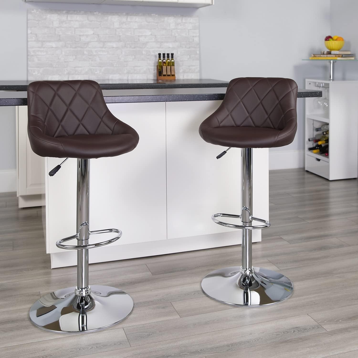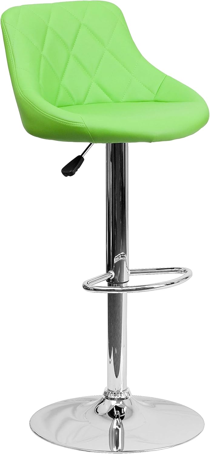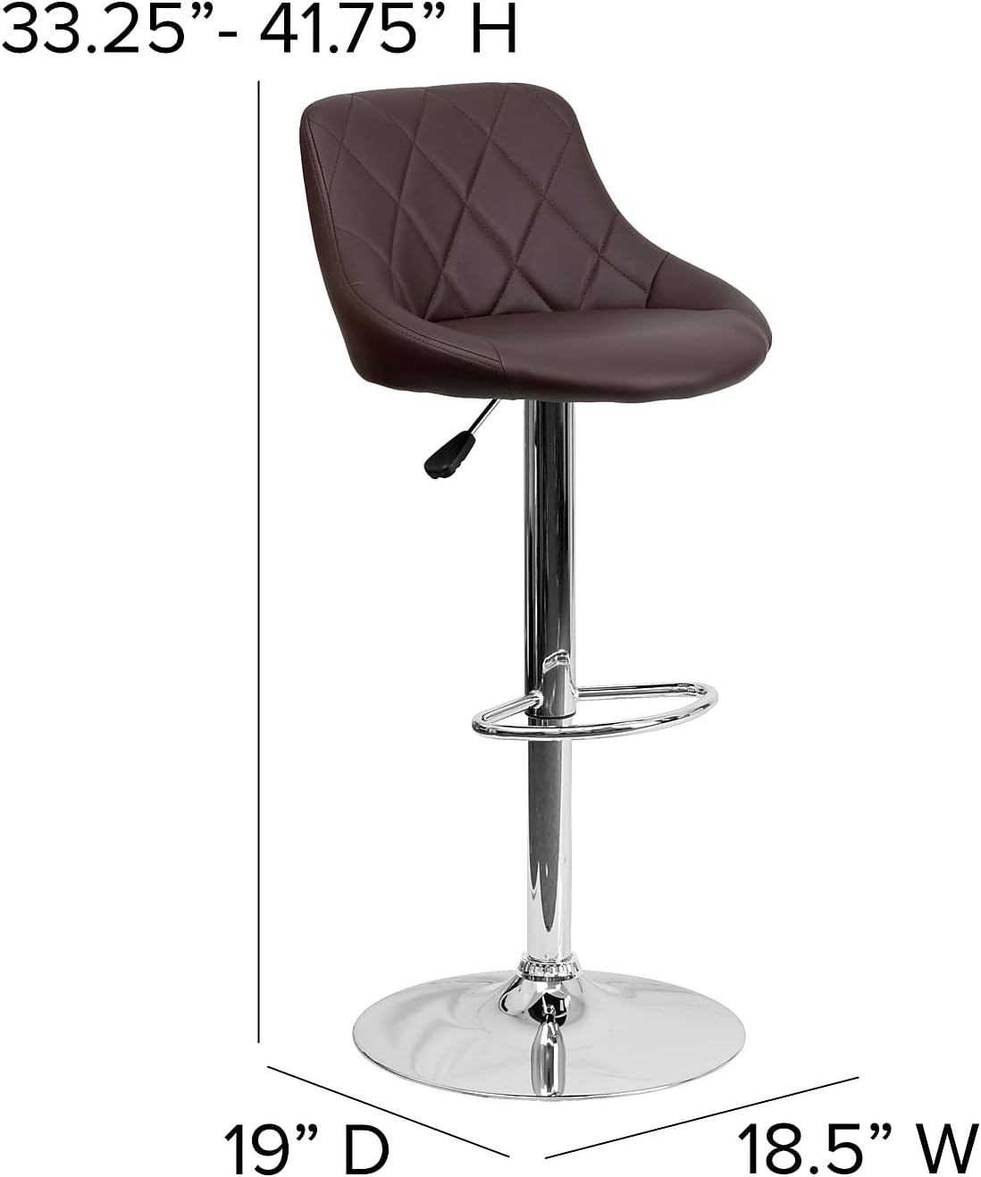 Classic style with a little zing perfectly describes this brown upholstered adjustable height barstool with a diamond patterned back. A bucket seat design will make this a great accent chair around the bar area or kitchen and the easy to clean vinyl upholstery is an added bonus. The height adjustable swivel seat adjusts from counter to bar height with the handle located below the seat while the chrome footrest supports your feet while also providing a contemporary chic design. To help protect your floors, the base features an embedded plastic ring.