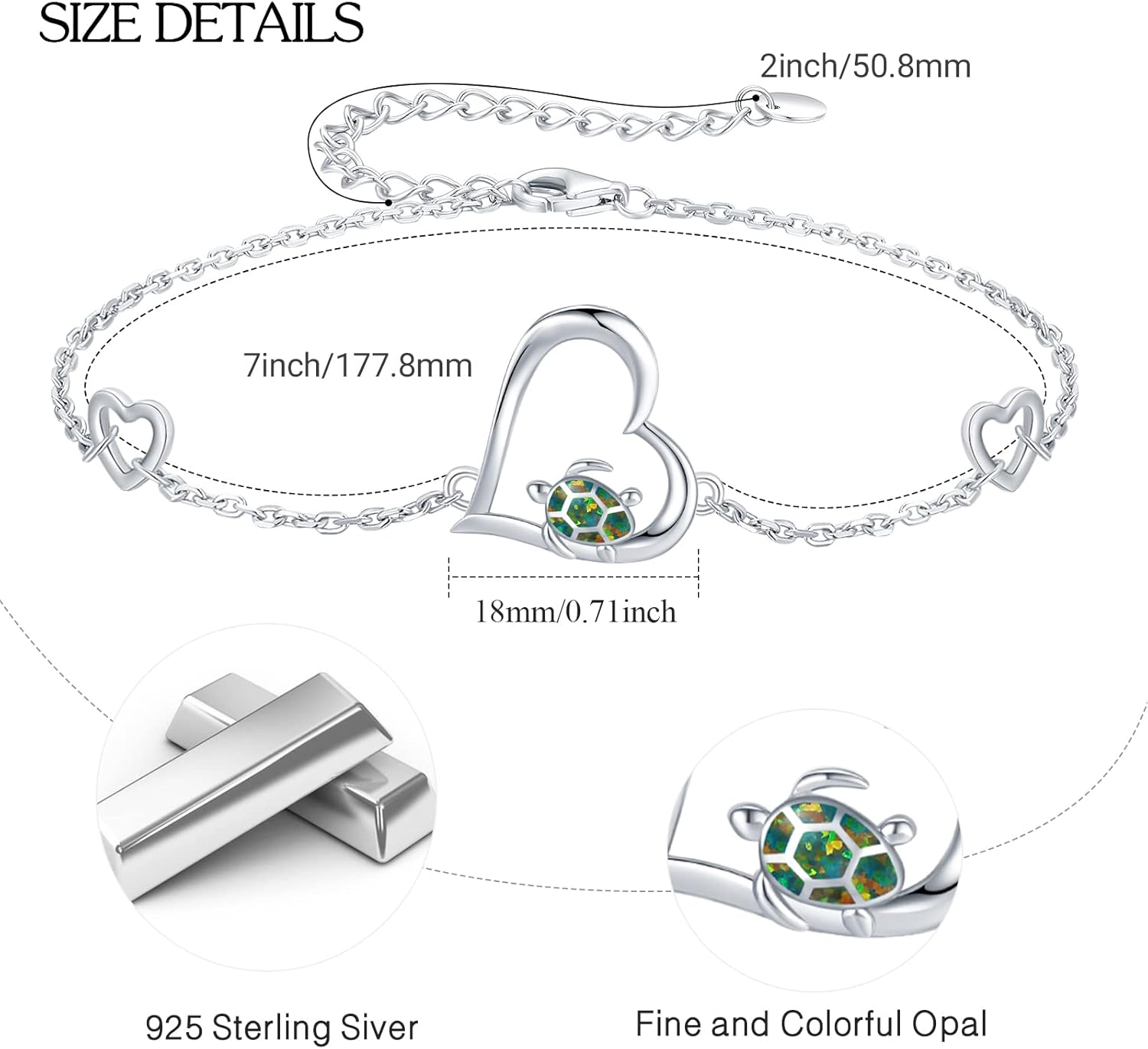 Heart Turtle Bracelet 925 Sterling Silver Green Opal Turtle Jewelry Sea Turtle Bracelets Ocean Nature Turtle Bracelet Turtle for Her for Women DESIGN & CONCEPT MEANING : What benefits silver can bring to us?Firstly, wearing silver products makes us more charmful and attractive. Secondly, it is helpful for our ear holes and skin to wear silver products because they are hypoallergenic. Last but not least, wearing silver products every day can keep us healthy! TOP MATERIAL : Cuoka silver products are certified real S925 sterling silver, polished and evenly shiny, We are the direct seller, No middlemen. This exquisite women turtle Bracelet gives you a totally fresh impression.Just be happy to add this opal turtle bracelet to your jewelry collection. Turtle Bracelet Gender: Women / Men Material: S925 Sterling Silver Occasions: Party, Wedding, Engagement, Daily, Anniversary, Graduation, etc BEAUTY Style: Elegant/ Fashion/p>How to Maintenance Silver Jewelry? 1.Keep it dry and avoid wearing it when bathing, swimming or other action involved in water. 2.Do not touch it often, grease and sweat on hands will caused corrosion. 3.Put it inside a soft cloth pocket or fabric swath,avoid it from rubbing against other jewelry. silver turtle Bracelet ✔ 1x Instruction Manual ✔ 1x Cleaning Cloth ✔ 1x Exquisite Gift Box Notes: 1.The product on the illustration may look bigger than the reality. 2.Please allow slight dimension difference due to different manual measurement.
