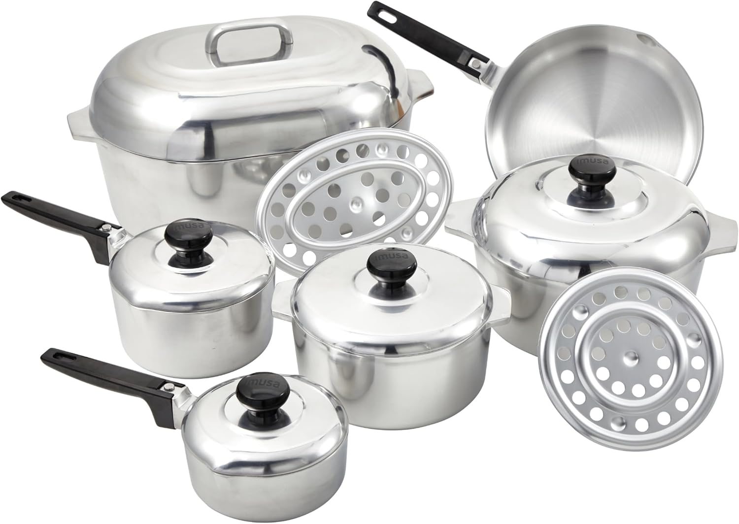 The IMUSA 8Piece cast aluminum cookware set, timeless design and commercial durability. The casting process enables IMUSA cookware to have varied thickness throughout the pans, maximizing heat conductivity. The pans boast extra thick bases, which allow heat to travel quickly and evenly up the pan sidewalls. Pouring spouts, heavy cast lids and cast-in flame guards combine to create a product durable and efficient enough to satisfy any culinary objective. The sleek retro styling and durable cast construction are the hallmark features of this enduring cookware line.
