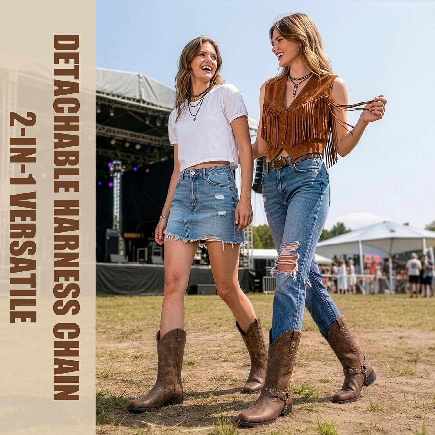 J's.o.l.e Women's Buckle Strap Wide Calf Cowboy Boots are a stunning blend of classic western charm and modern fashion. Stand out from the crowd with striking harness strap that wraps around the ankle. This eye-catching accent is adorned with metallic studs, an ornate floral conchos, and a distinctive chain at the heel, adding a touch of biker-inspired flair to the classic cowboy silhouette for a truly unique and personalized statement. Or easily unclip and remove the harness chain for a more traditional and classic cowboy boots appearance. This 2-in-1 versatility makes it the most adaptable western boots in your collection.