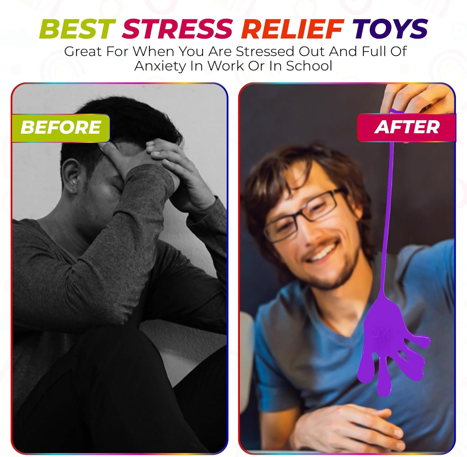 These jumbo sticky hands are sure to provide endless fun and entertainment. At over 12 inches long each, these extra large stretchy hands are the perfect party favor or goody bag stuffer. Whether you're a kid or a kid at heart, you'll love watching these giant hands stick to nearly any smooth surface. They're great for fidgeting or just pulling silly faces. With an assortment of colors and designs in each 4-pack, you're guaranteed to find your new favorite pair. Clean removal means no residue left behind. Hours of stress-relieving entertainment awaits - grab a pack and see why these giant sticky hands are a classroom and party favorite. Suitable for ages 3 and up.