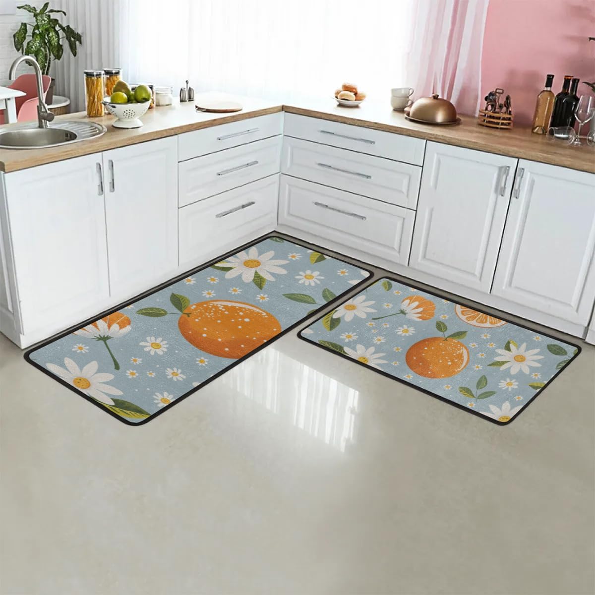 Features:1. This office floor mat is made of premium polyester surface, water-absorbent nonwoven interlayer and anti-slip backing, ensuring durability and lasting use.2. 0.4 inch thick rugs for bathroom floor offers supportive cushioning, allowing you to stand comfortably for longer periods in the kitchen.3. The non-slip backing keeps the floor mats for house in place, avoiding accidental slipping or falling. They are great kitchen products.4. The anti-skid backing makes the kitchen mats for floor 2 piece suitable for most floors, including hardwood floor and tile floor.5. The bathroom rug sets 2 piece measure 17"x47"+17"x29", which provides a spacious standing area, making it a practical addition for various tasks at home or in the office.6. The stain-resistant material makes the washable bathroom rugs easy to clean with vacuum cleaner and washing machine, save your time, no pilling, no color fading.Functions:1. The washable rug runner can be used as kitchen rug, runner rug, entryway rug, laundry room rug, office rug, hallway rug, bathroom rug runner, etc. They are is new home must haves.2. As a non slip rug used in cooking areas, they will keep your floor from scratches, scuffs and spills. Also the soft and cushioned non slip runner rug provides anti-break protection for the fragile bowls.3. With a wide selection of colors and patterns, our kitchen rugs washable compliment nicely with any home decor, adding decor to any room, enhancing the aesthetic appeal of your home.Note:The bath rug set includes 2 pieces non slip kitchen rug.Wrinkles may occur during shipping, place in direct sunlight or use a hair dryer to dry the wrinkles away.