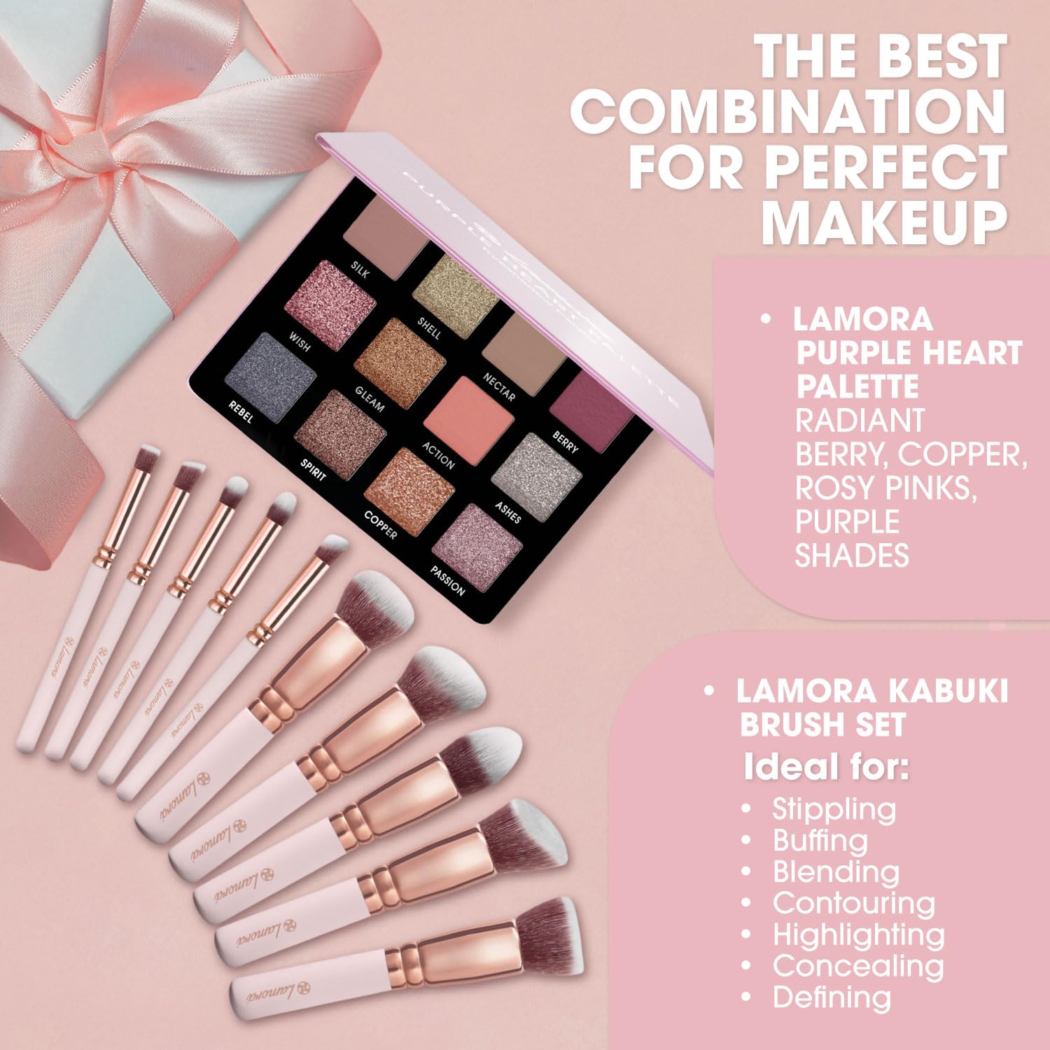 Kabuki eye and face makeup brush set with a beautiful 12 colors rose smokey eyeshadow palette.