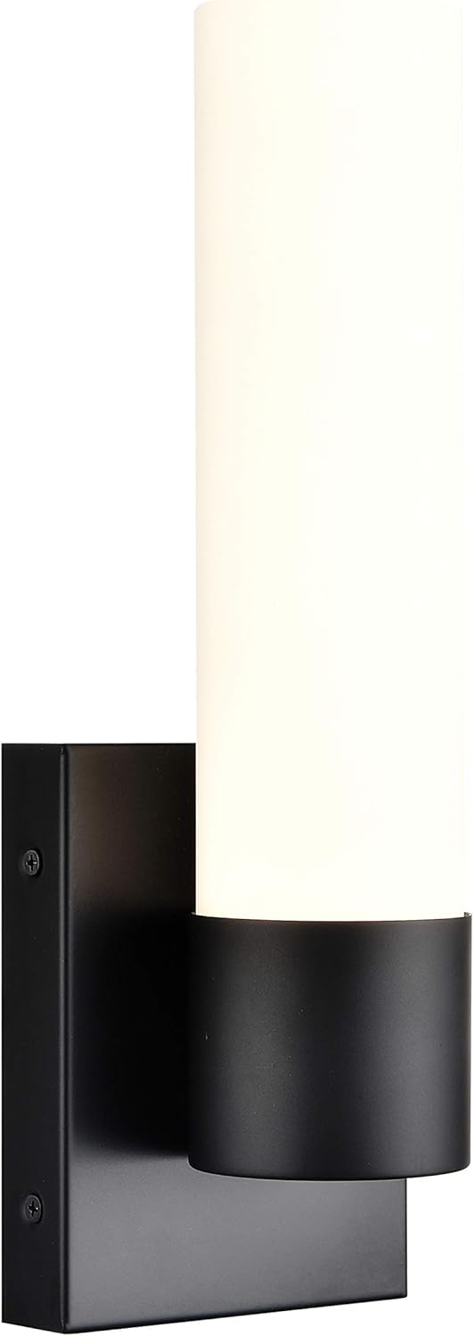 The Perpetua LED Bathroom vanity wall sconce light fixture brightens any room with its striking contemporary design. Featuring a frosted glass cylinder and brushed nickel housing, this sconce is a good fit fort a bathroom wall lamp. The integrated warm white LED bulb gives ampl;e illumination. This is a perfect selection for bathroom lighting, entryway lights, hallway wall lamps and more. Metal construction with a black finish and white frosted glass shades Measures 13.5 inches high by 4.5 inches wide; extends 4.5 inches from the wall Dimmable when used with a dimmable bulb and ELV dimmer switch Includes 15.5W integrated, super bright, warm white LED, 3000k color temperature Damp rated. ETL listed
