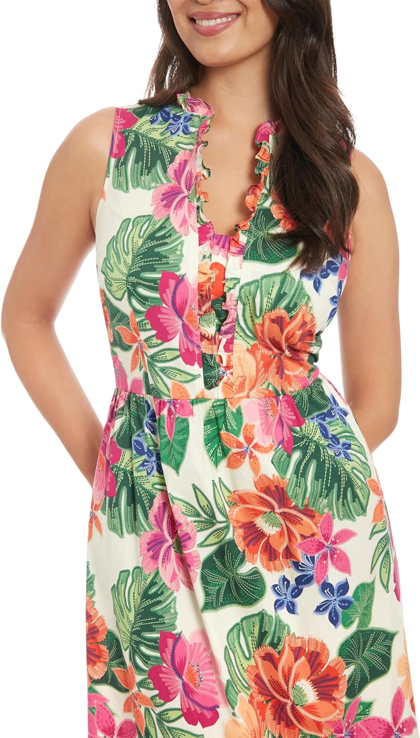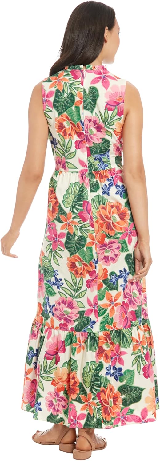 Elegant a-line maxi dress with defined waistline, mandarin collar, and partial button front. Tiered ruffled hem crafted from lightweight printed cotton poplin, creating a graceful silhouette.