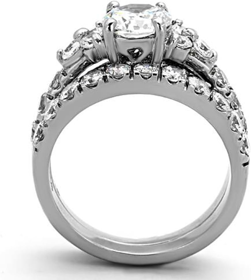 Women's RingThis beautiful 2 piece high polished stainless steel 316, AAA grade cubic zirconia wedding set is Amazing! Made of solid surgical stainless steel with no plating and a high polished finish. This engagement Ring showcases a 1.28 ct (7mm) round brilliant cut cubic zirconia center stone accented by 12 round cut side stones. Matching wedding band has 10 round cut stones in a prong setting. The total approximate diamond equivalent weight is 2.50 carat. Our stones are made of the highest quality, is cut to perfection and display amazing clarity,! Stainless steel 316 jewelry is very durable and will never oxidize.Men's Ring Unisex two-tone solid titanium comfort fit wedding band. Made of solid titanium with high quality black ion plating. This Ring showcases 9 round brilliant cut cubic zirconia stones in a pave setting. Our stones are made of the highest quality, is cut to perfection and display amazing clarity,! Interior of band is slightly rounded to provide a comfortable fit.?