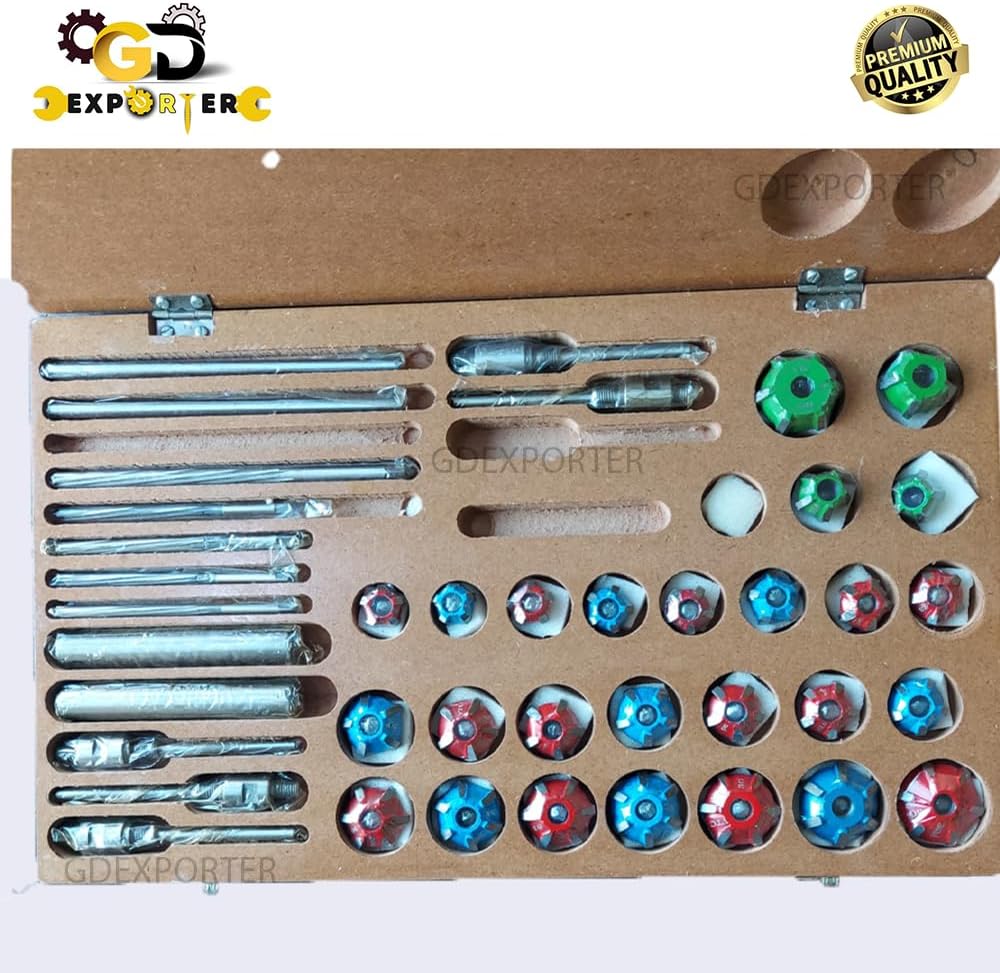 Motorcycles Valve Seat cutter Kit Carbide Tipped 3 Angles Cut Performance Head 30 Degree, 45 Degree, 60 Degree Racing Kart, Clone, Predator, Hemi, Briggs, BSP most Motorcycles or engines if they have a 4.5, 5, 5.5, 6,7 mm, 1/4" mm valve stem, If you are building or rebuilding your own small engines, either for performance or just a quality rebuild, this gives you control of cutting your own valve seats you can do a standard 45 degree seat or even 3 angle seat with this set... you can move the sealing surface on the seat for best performance... this is ONLY if you have 4.5, 5, 5.5, 6,7 mm , 1/4" valve stems this kit comes with the following. 1st Top Angle & 2nd Base Angel Cutters Valve seat cutters: 22 mm 30,45 degree 23 mm 30,45 degree 24 mm 30,45 degree 25 mm 30,45 degree 26 mm 30,45 degree 27 mm 30,45 degree 28 mm 30,45 degree 29 mm 30,45 degree 30 mm 30,45 degree 32 mm 30,45 degree 34 mm 30,45 degree 3rd Throat Angle Cutters 23 mm 60 degree 25 mm 60 degree 28 mm 60 degree 30 mm 60 degree 32 mm 60 degree Valve Guide Stems : 4.5, 5, 5.5, 6,7 mm , 1/4" Valve Guide Reamers H.S.S 4.5, 5, 5.5, 6,7 mm , 1/4" 2 x T - HANDEL 2 x DRIVE RODS WOODEN CASE