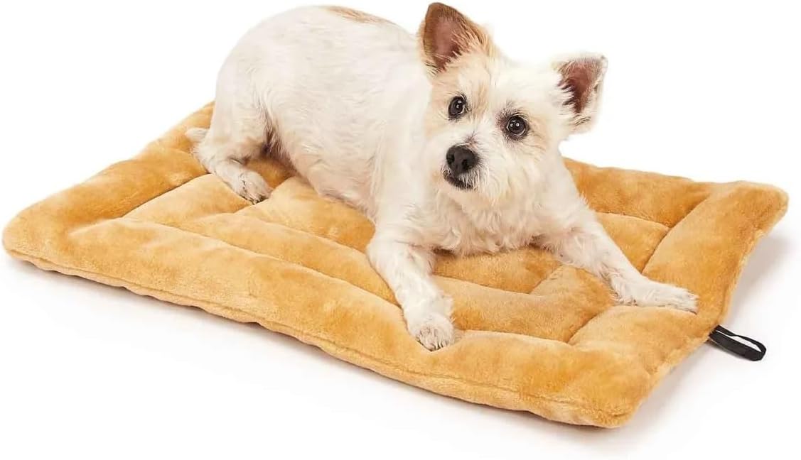 Golden Tan Plush Crate Mat Beds for Dogs. Versatile and durable Plush Mats keep pets comfortable and protect them from drafts and cold floors. Fit most common size crates and can be used as a stand alone bed. Double-sided plush fur. Polyfiber batting for extra comfort. Double stitched for durability. Easy to clean and maintain. All sizes measure 1 1/4" thick. Material: Double-sided plush fur; Polyfiber batting. Color: Golden Tan (Sand) Available in 6 Sizes Care: Machine wash/dry, low temperatures. Sizing Guide: Bed: When dog is laying down, measure pet’s body length from base of tail to tip of nose, and add a minimum of 9"-12". For bolster or cuddler style beds, add a minimum of 4"-6". Crate Mat: Refer to the base dimensions of your crate or kennel. If dimensions do not match exactly, we recommend selecting a crate mat 1/2"-1" smaller than the base dimensions of your crate. Available Sizes: Small 18" x 13" Medium 23" x 16" Medium/Large 26" x 17" Large 32" x 20" X-Large 35" x 22" XX-Large 41" X 27"