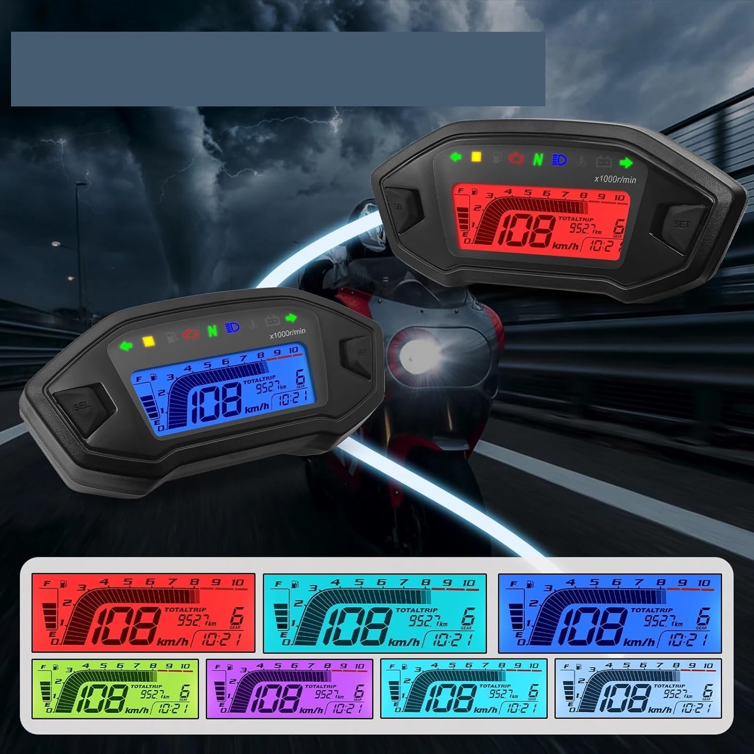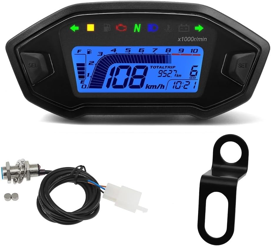 The Motorcycle Meter Display Speedometer craftsmanship, sturdy and durable, not easy to damage, reliable quality, can bring you a comfortable experience.Motorcycle Speedometer Universal Moto Dashboard 7 Colors Backlight Adjust Fuel Gauge Odometer Digital for 1 2 4 CylinderFeature:-- As a practical equiment for your Motorcycle.-- Engine trouble light reminding.-- Displaying time.-- Total travel distance.Description:Product Name: Motorcycle OdometerBlack: positive yellowRed: battery positive blue/redBlue: High beam, 12V is controlled Green/BlackBlue and white: fuel signal lineBlack and white: sensor signalOperating voltage: 10V-15VSpeed calibration: 42.5Hz corresponds to 60KM/HGreen: negative sensorSpeed calibration: 166Hz corresponds to 13*1000r/minscreen: 7 colors backlight short press to switchVoltage: Less than 11.3V undervoltage symbol flashes, higher than 11.7V undervoltage symbol is not displayedFuel calibration: E point 98, F point 8Orange: Left turn, 12V positive control yellow/whiteLight blue: Turn right, 12V is controlled Green/RedPackage Includes:1 x Motorcycle Meter
