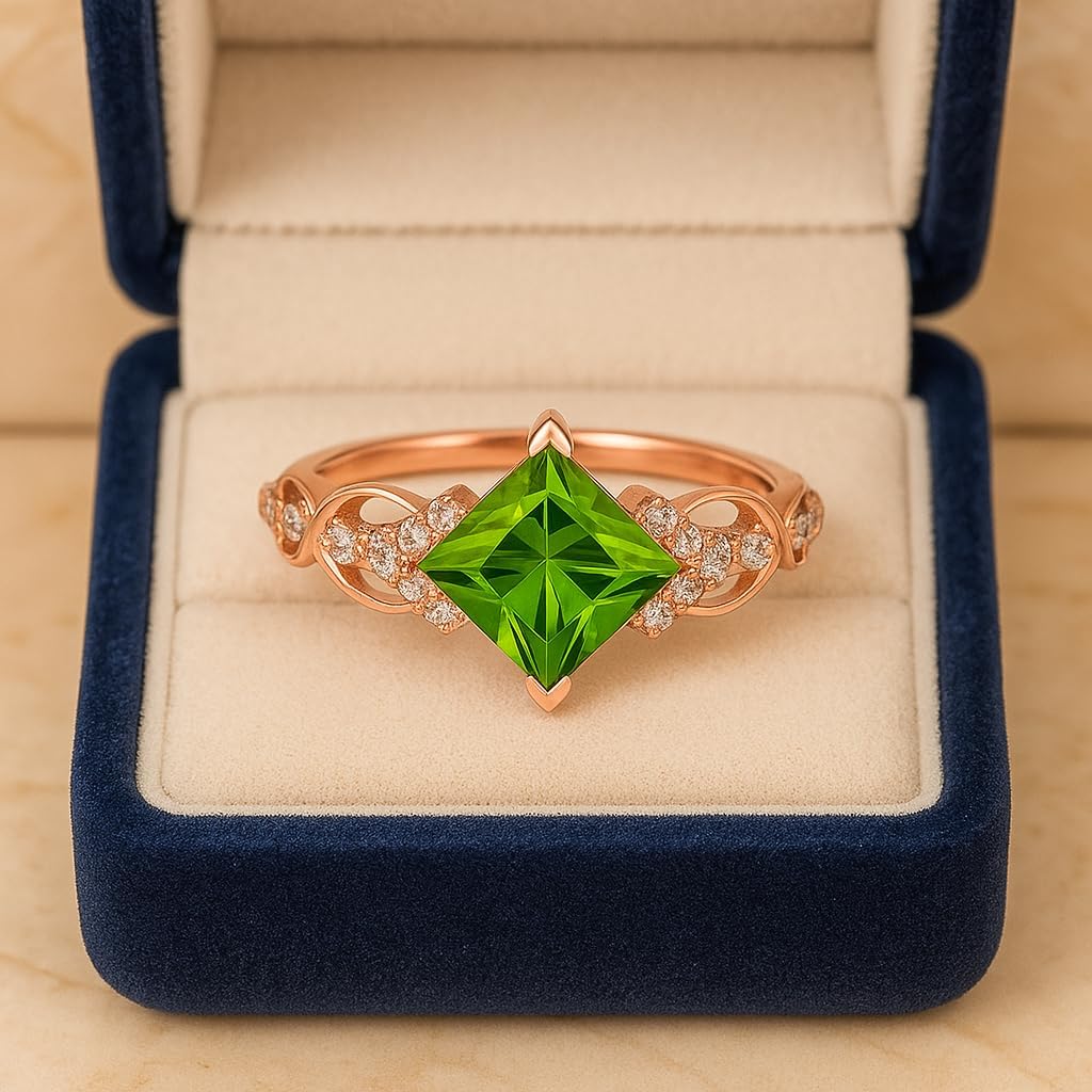 Celebrate elegance, harmony, and heartfelt meaning with this exquisite Princess Cut Peridot Engagement Ring. The bright, vivid green peridot sits proudly at the center, cut in a perfect princess shape for maximum brilliance and symmetry. Surrounding the gemstone, an intricately designed 14K rose gold infinity band symbolizes eternal love and connection. Sparkling diamond accents along the band add graceful shine, giving this ring a refined vintage-inspired appeal. Whether chosen as a promise ring, engagement ring, anniversary gift, or personal treasure, this piece is designed to stand out with charm, color, and sophistication. A meaningful jewelry gift for the woman who loves artistic details, symbolic design, and timeless beauty