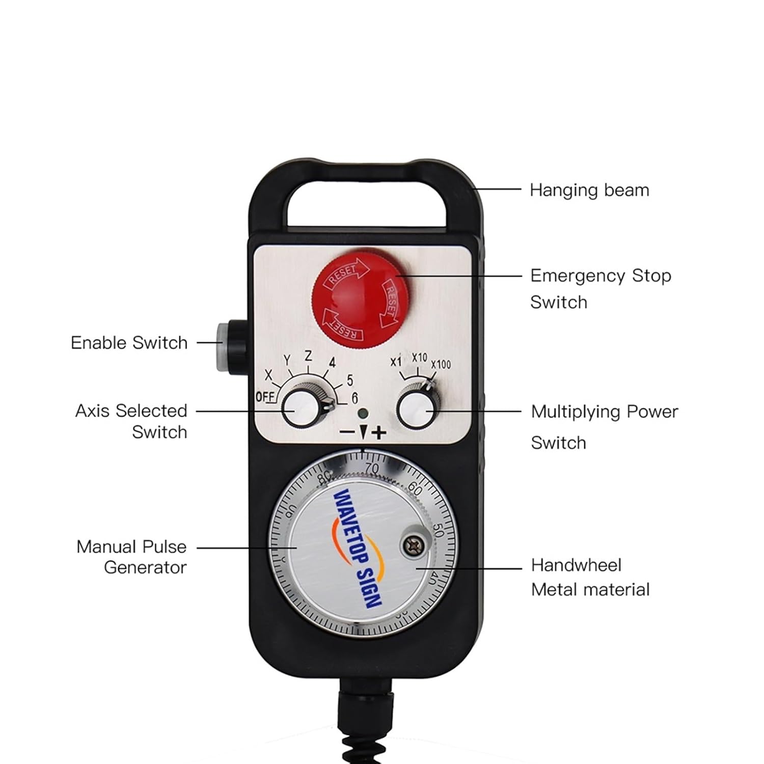 Pulse GeneratorsSpecification:1. x1, x10, x100 switch2. X,Y,Z,4th axis selector switch3. LED indicator4. With Emergency stop5. professional chassis6. 6ft extendable shielded cable cord7. Magnetic base holder can place anywhere on the machine steel surface8. Required 5V+, 150mA, power for MPG9. Phase output is A ,/A and B,/B;10. TTL output, drive capability +-20mA;Description: The 4 Axis handheld controller MPG Pendant with x1, x10, x100 selectable, You are bidding one complete unit of the MPG pendant with Emergency stop for 4 axis machine, it equipped with our popular machined MPG unit with 4 axis and scale selector, LED indicator also send feedback from the machine to user about the status of the unit.All Wiring isolated from MPG unit and provide a easy to install wiring diagram, it suit both commercial machine as a replacement jog control unit or other computer based controller. Which add great control flexibility to the system.