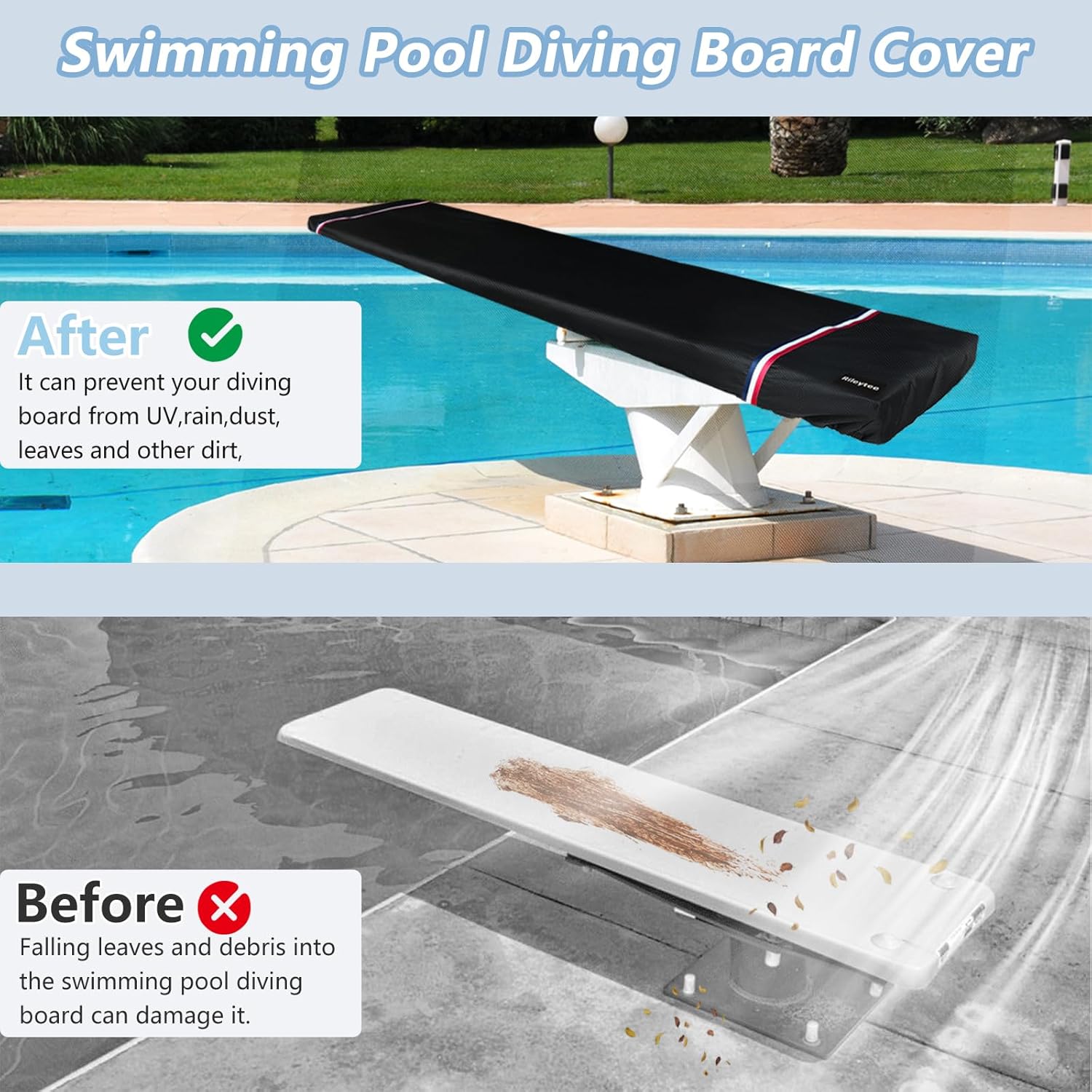 PRODUCT INFORMATIONSize:96"L x 17.25"W x 2"HTexture of material:Waterproof 600D fabric.Features:Waterproof,Dustproof,Anti-UV,All-Season Protection.Package Contents:1 x Diving Board Cover,1 x Storage bag