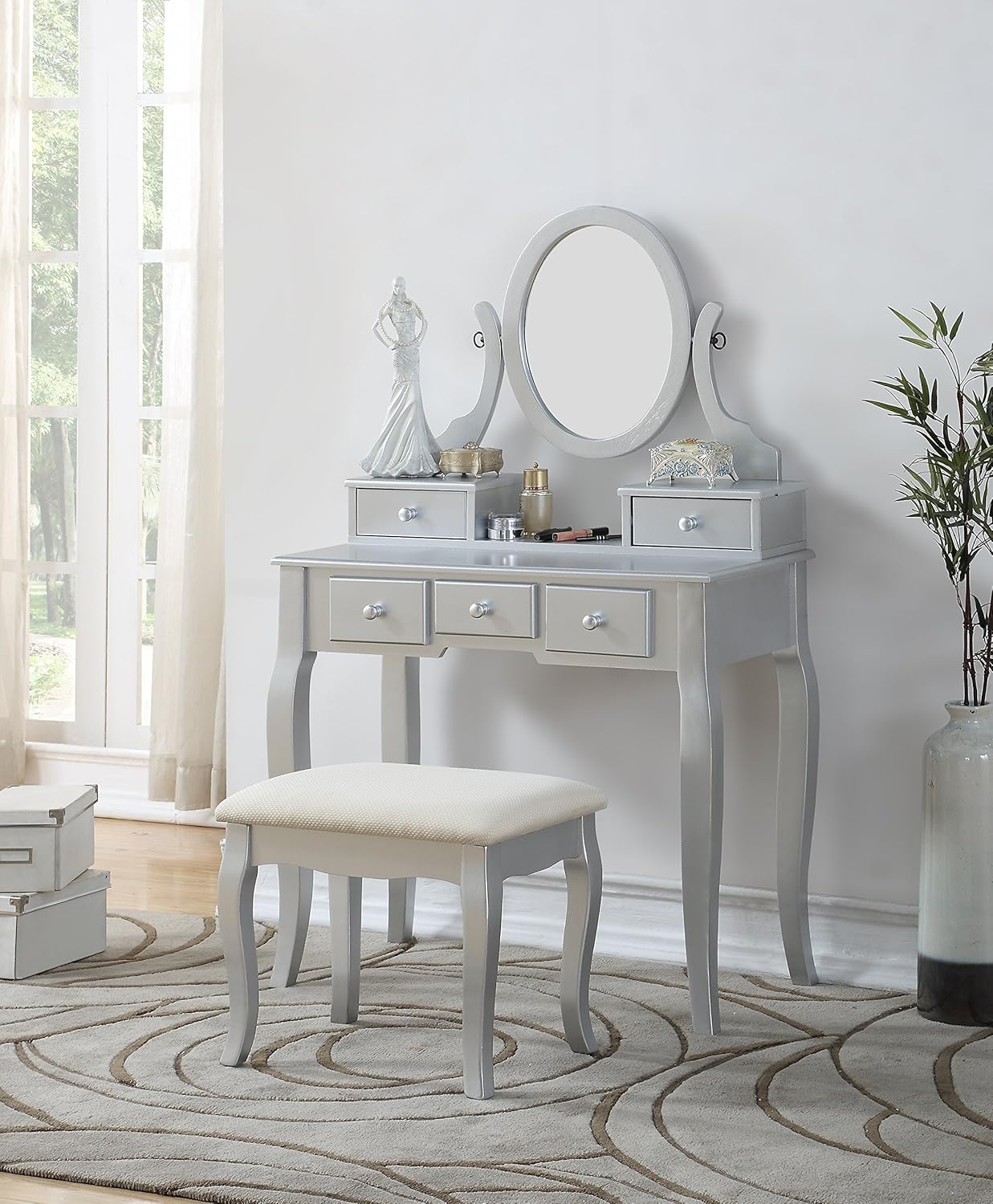This stylish contemporary vanity table comes with swivel adjustable mirrors and 5 storage drawers. It's great for storing all your jewelry and a smooth tabletop provides space for cosmetics and beauty supplies. It also includes a matching wooden stool with padded upholstered seat. This is sure to accent your bedroom.