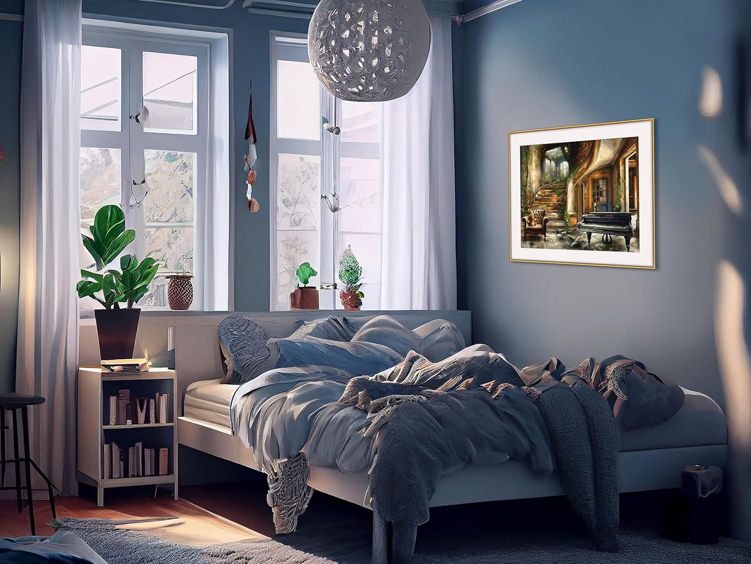 This detailed paint by number features a beautiful home lost to time with plants and vines growing up the walls and the winding staircase. At the base of the stairs, a teddy bear sits in an armchair next to a grand piano. This premium paint by number kit is created by a well-known German artist with high-quality pre-mixed artist’s paints. Kit includes pre-printed textured art board, pre-mixed acrylic paints, artist paintbrush, and easy instructions. Finished painting measures 20 x 16" (50 x 40cm). Paint by number kit includes pre-printed textured art board, pre-mixed acrylic paints, artist paintbrush, and easy instructions. Artwork features a teddy bear sitting on a chair next to a grand piano at the bottom of a winding staircase in an abandoned hose with leafy vines growing up the walls. Painting measures 20 x 16" (50 x 40cm). Frame not included.
