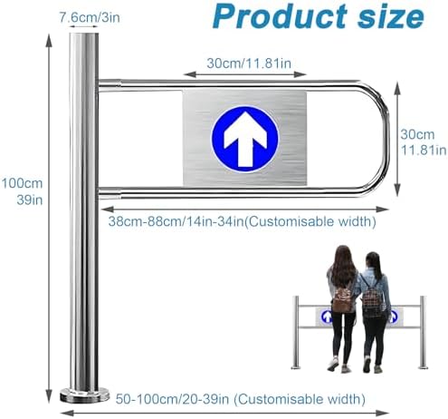 Enhance crowd control and streamline entrance and exit management at public venues with our premium stainless steel entrance and exit device. Perfect for shopping malls, hospitals, workshops, and other busy environments, this device is engineered to boost operational efficiency and improve user experience. **Key Features:** 1. **Versatile Dimensions:** Standing at a height of 100cm (39in) with a customizable width, this device adapts to various space requirements. 2. **Single-Direction Access:** The thoughtfully designed front-facing swing door allows for smooth entry, ensuring a clear flow of foot traffic. 3. **Durable Construction:** Crafted from waterproof and wear-resistant stainless steel, this entrance device is built to withstand high usage and maintain its appearance over time. 4. **Hassle-Free Installation:** With a minimal footprint and straightforward setup, you can quickly install this device and put it into immediate service. 5. **Stable and Secure:** The device is anchored to the floor using expansion screws, reducing the risk of tipping and ensuring stability in busy areas. 6. **Automatic Rebound Mechanism:** The spring-loaded doorposts allow the door to rebound automatically, enhancing convenience for users. 7. **User-Friendly Operation:** Simply push to open; the door closes automatically behind you, promoting a smooth and efficient flow of traffic. **Specifications:** - **Material:** Stainless steel - **Gatepost Diameter:** 7.6cm (3in) - **Gatepost Height:** 100cm (39in) - **Swing Arm Height:** 30cm (11.81in) - **Overall Width:** Customizable from 50-100cm (20-39in) **Package Includes:** - One-way pedestrian access door x1 - Arrow sticker x1 - Prohibition sticker x1 - Expansion screws x4 - Wrench x1 **Note:** This package contains only the revolving door; other items shown are not included. This device is intended as a one-way entrance guide and is not designed as an anti-theft solution. Please note that colors may vary slightly due to ...