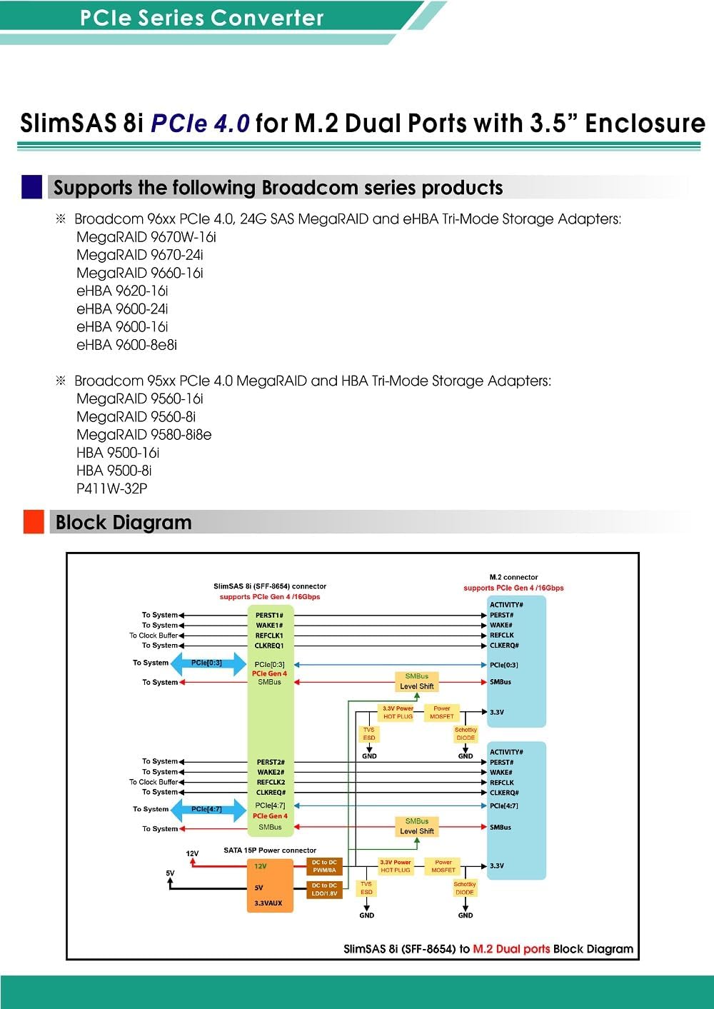 Upgrade your storage system with the SlimSAS 8i to M.2 Dual Ports Adapter, designed for high-performance environments. This adapter enables seamless integration of M.2 NVMe SSDs with your existing SlimSAS 8i interface, offering dual M.2 ports for expanded storage and improved speed. Ideal for Broadcom MegaRAID & HBA Tri-Mode & NVMe Switch systems. Key Features: 1. Dual M.2 Ports: Connect two M.2 NVMe SSDs to significantly boost storage capacity and performance. Perfect for applications requiring rapid data access and high throughput. 2. Broadcom MegaRAID Compatibility: Fully compatible with Broadcom MegaRAID & HBA Tri-Mode & NVMe Switch. 3. High-Speed Data Transfer: Achieves fast data transfer rates, enhancing system responsiveness and efficiency. Ideal for high-performance computing, data-intensive tasks, and heavy workloads. 4. Easy Installation: Designed for hassle-free installation with no additional drivers needed in most systems. Plug and play functionality makes setup straightforward and quick. 5. Durable and Reliable: Built with high-quality materials to ensure long-lasting performance and reliability under demanding conditions. Applications: 1. Server Environments: Ideal for expanding server storage, enabling rapid data access and management for critical applications. 2. Workstations: Perfect for workstations that require enhanced storage capabilities for tasks like video editing, gaming, and large-scale data processing. 3. Data-Intensive Tasks: Enhance performance in environments that handle large volumes of data, such as database management, simulations, and high-frequency trading. The SlimSAS 8i to M.2 Dual Ports Adapter is engineered to meet the demands of modern computing and storage. Its dual M.2 ports provide flexibility and high performance. Whether upgrading an existing setup or building a new one, this adapter ensures efficient and reliable operation, making it a valuable addition to any high-performance environment.