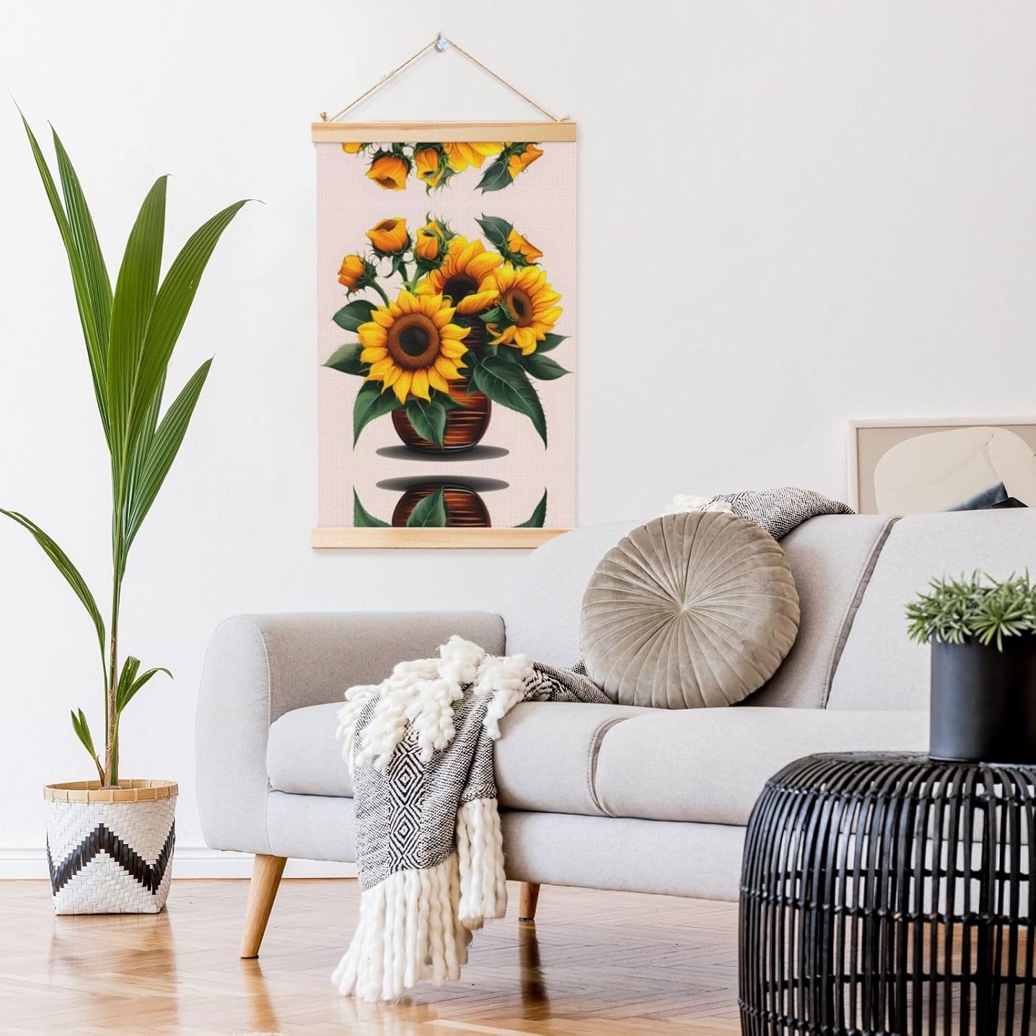 Our Sunflower And Rose Print Wooden Poster Hanger Is An Excellent Addition To Your Home Decor Or A Perfect Gift For Friends And Family. Made Of Selected Quality Canvas With Brilliant And Enduring Colors, This Wall Art Is Designed To Resist Water, Dust, And Fading, Ensuring The Bright And Vibrant Art Lasts. The Polyester Is Enclosed Between Two Teak Wood Hanger Scrolls With An Attached 35cm Rope For Easy Hanging. Installation Is Made Simple With The Included Two Nails In A Plastic Box. The Modern Minimalist Style Of Our Wall Hanging Complements Any Home Decor, Elevating The Artistic Ambiance And Brightening Up The Room. Experience The Elegant Transformation This Wall Hanging Scroll Painting Brings To Your Spaces Today.