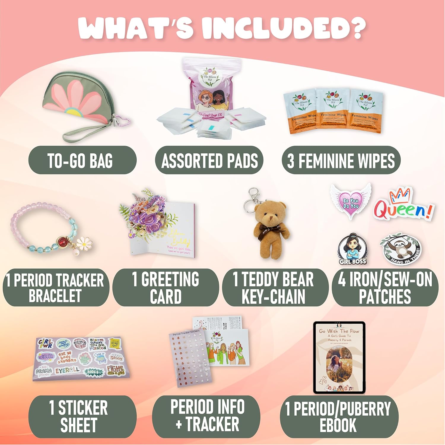 | Included Components | 6 pads, 5 liners, 3 gentle feminine wipes, a stylish to-go bag with a detachable wrist strap and clip, a period tracker bracelet, a charming teddy bear keychain, and iron-on patches |