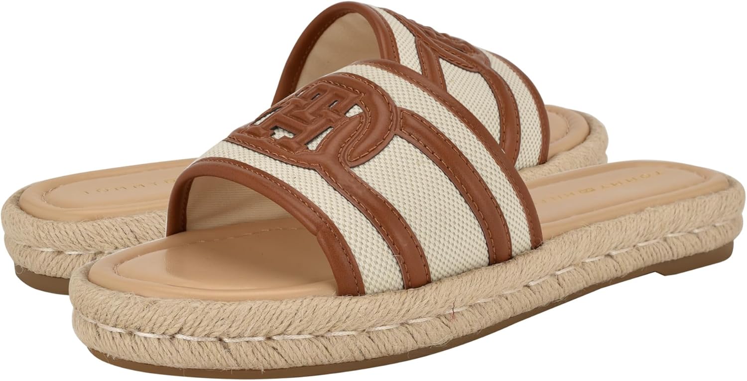 The Tommy Hilfiger Women's Hadjea with a dimensional logo stands out atop the one band vamp of this espadrille-inspired sandal lifted by a subtle, jute-wrapped platform. Crafted from polyester upper, lining, and leather insole, this pair of footwear features open round toe, slip-on style, and low-top silhouette. Leather outsole.