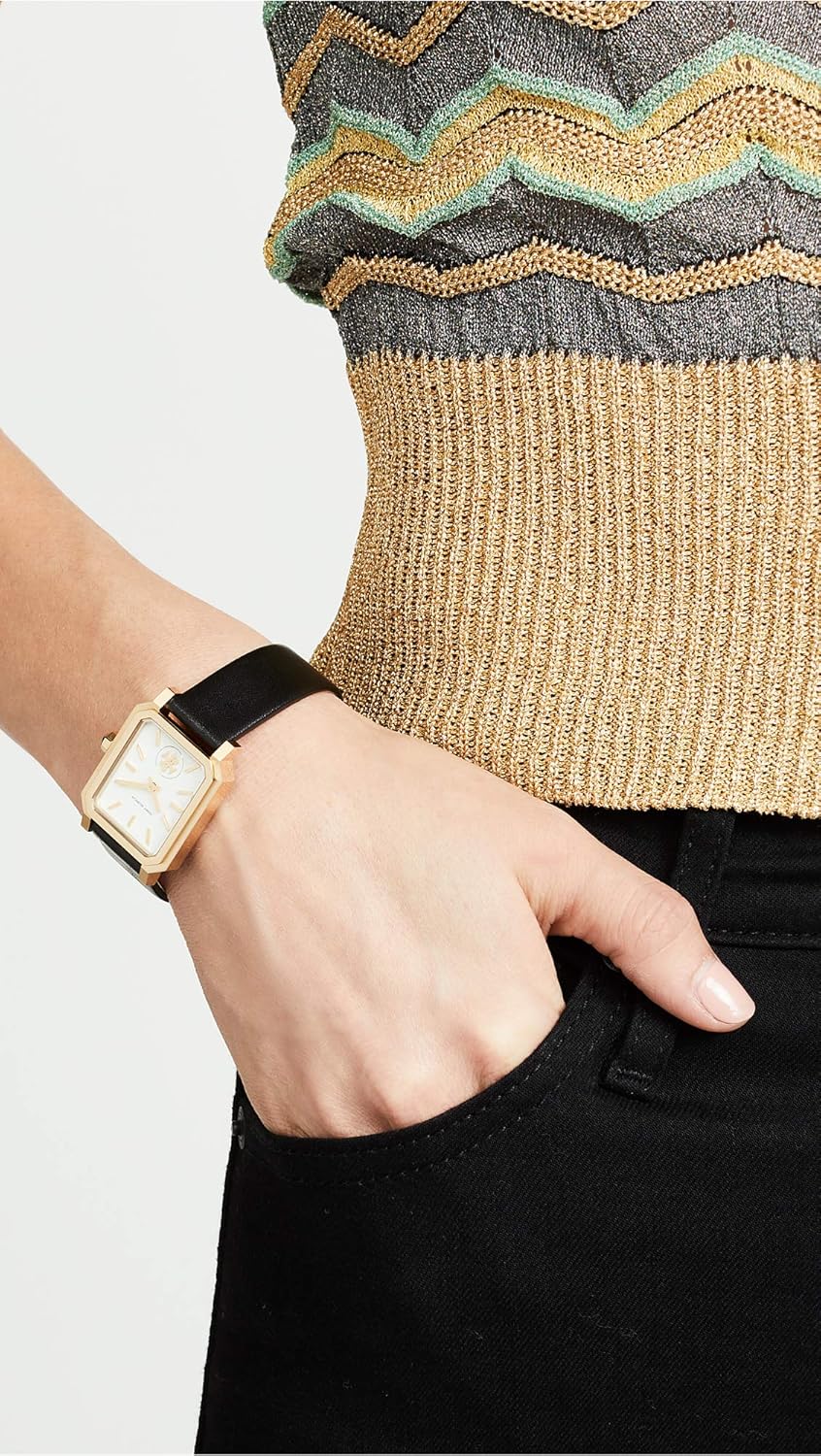 Cream dial enhanced by yellow gold-tone hands. Yellow Gold-tone stainless steel case with a black leather band. Quartz movement. 30 meters / 100 feet water resistance. Fixed bezel. Scratch Resistant Mineral crystal. Solid caseback. Buckle clasp. Pull / Push crown. Case size 27 x 29 mm x 7 mm. Band 16 mm x long. Tory Burch TBW1504 Robinson Watch.