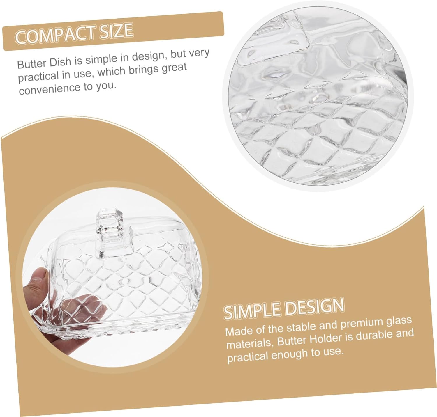 Package List 1 x Butter Dish 1 x Glass Lid Characteristics - Size: 17.00X10.50X9.50cm/6.68X4.13X3.73in small butter dish -Product Info:Fresh box -Material:Glass butter storage dish with lid -This butter holder has a smooth surface, and fine details, and it's easy to clean, making your life convenient butter dish. -This Butter Dish is made of good glass material, which is and high-grade, relieved and to use cheese dish with lid. -Proper size, this butter dish is convenient access to your butter right when you need it glass dish with lid. -This butter dish with lid can be used to store butter, can also be used to store dessert, etc glass butter dish with cover. -Elegant appearance makes it an excellent addition to your kitchen, refined and functional butter dishes. - ColorTransparent butter keeper dishGoods Informationbutter storage dish with lid The simple design, can make your kitchen, dining room and so a higher level.clear butter dish This Covered Butter Dish is suitable for most brands of butter.glass butter dish with lid This butter dish can be used to store butter, can also be used to store cheese, dessert, etc.butter holder with lid This butter dish with lid can be used to store butter, can also be used to store dessert, etc.butter containers Made of and