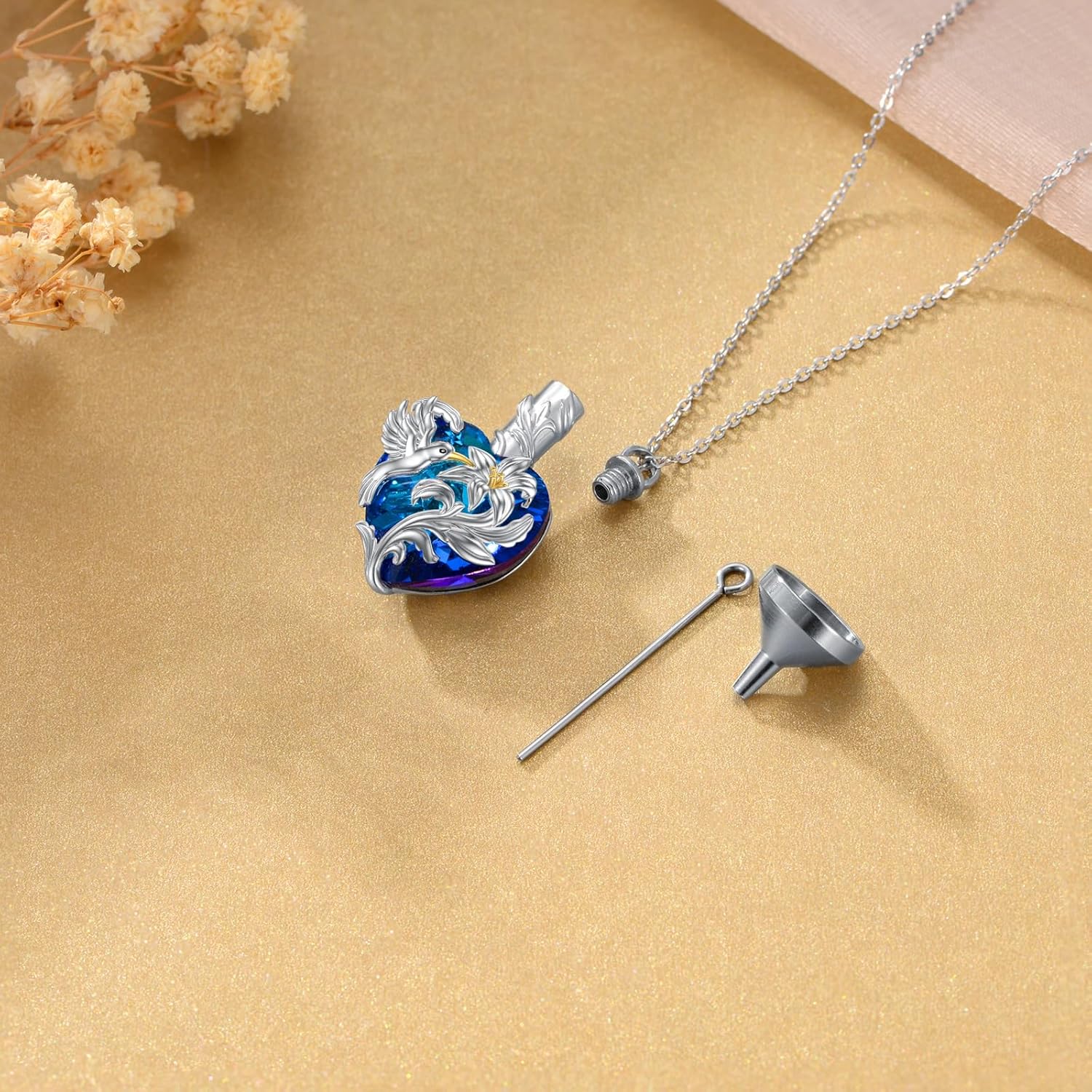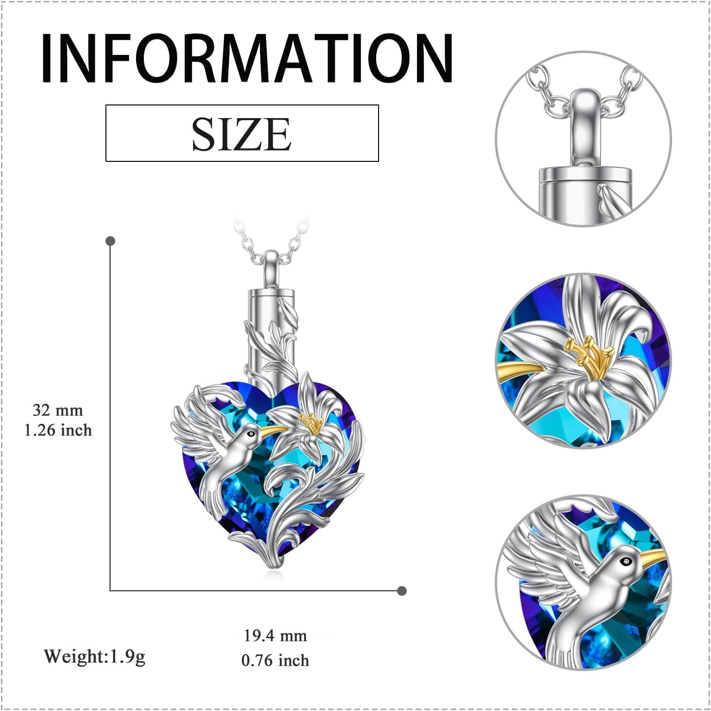 | Style | Pendant necklace with a hummingbird design and crystal heart accent, made of sterling silver gold plating cable chain |