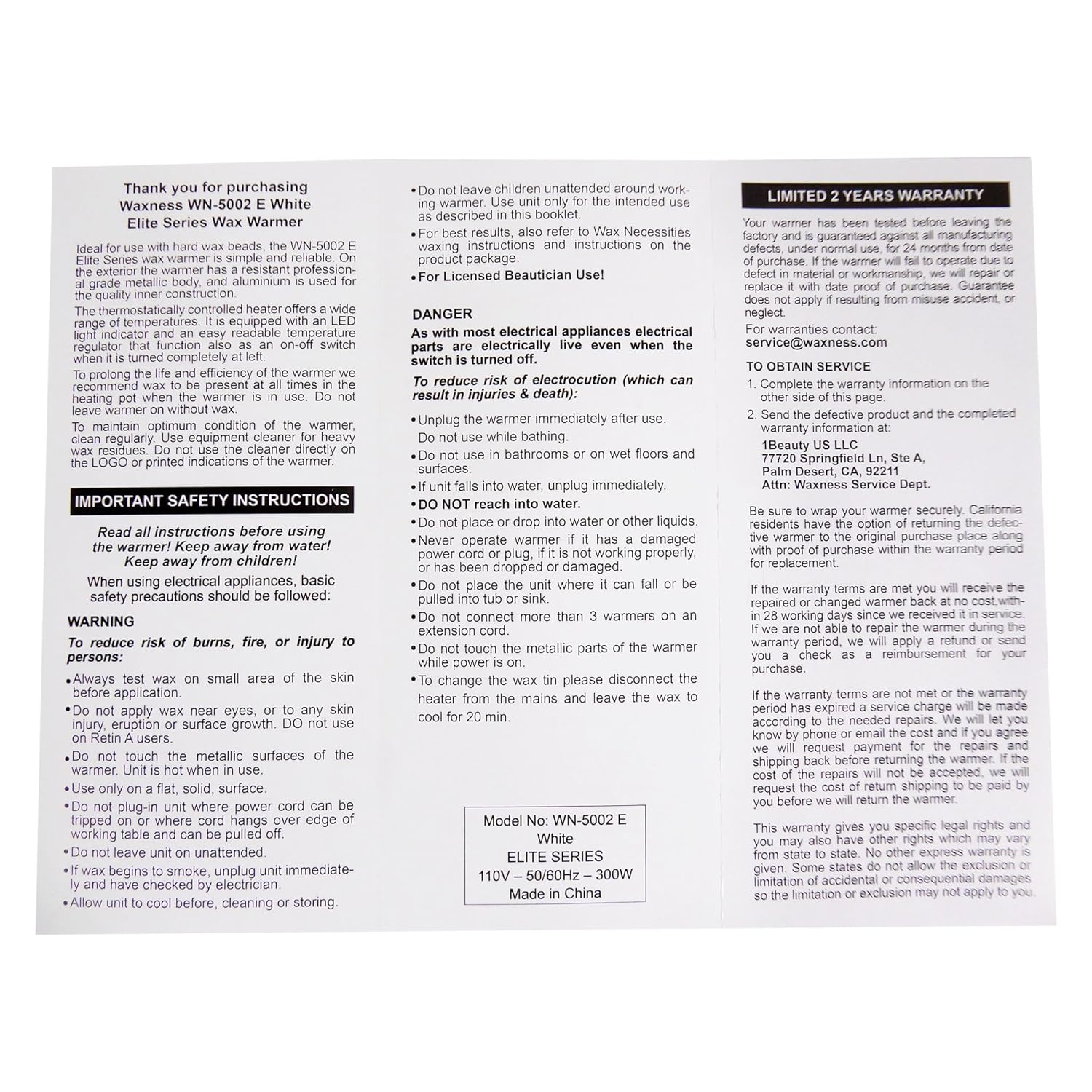 The Double Wax Heater is suitable for hard and soft depilatory Wax. Fits most wax brand tins on the market. Do not use this heater with Paraffin Wax. It melts all types of depilatory waxes: canned, broken, and in block form. Its internal heating element is built to last. A 4-1/8``diameter, 2 1/4`` deep interior heating chamber is designed to support most wax containers, such as 14-ounce size and other cans of the same diameter. The warmer includes one removable metal wax pot liner for use with loose wax, direct pouring, and easy cleaning. It measures 4`` in diameter and 2-5/8`` deep, will hold up to 18 fluid ounces of wax, and has a metal handle for convenience and safety. Use caution when handling hot items). The thermostat control knob and circular heating element can be dialed back to medium to maintain ideal consistency. RoHS certified. Dimensions: units measure 7-1/4'' in diameter, 5-3/8` tall. Includes. - wax heating machine (wax not included). - two removable wax pot liners. - USA standard grounded power cord (120 volt). - instructions/owner`s manual. Warning: For Beautician Use !. Do not touch the metallic parts of the heater when in use. Test the wax on a small area before the treatment. Not for paraffin treatments.