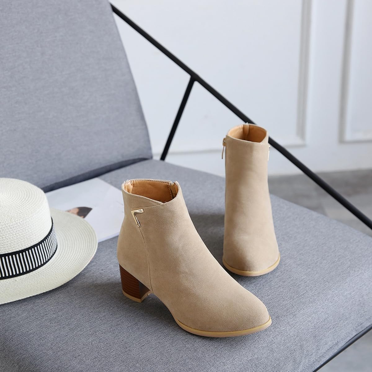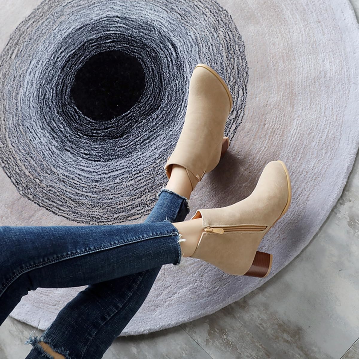 Women's Chunky Mid Heels Dressy Ankle Boots Suede Round Toe Side Zipper Winter Fall Short BootiesSize Chart:Size 4 US = EU34 = Heel to Toe 22.0cm/8.66"Size 4.5 US = EU34 =Heel to Toe 22.0cm/8.86"Size 5 US = EU35 = Heel to Toe 22.5cm/9.06"Size 5.5 US = EU36 = Heel to Toe 23cm/9.06"Size 6 US = EU37 = Heel to Toe 23.5cm/9.25"Size 6.5 US = EU37 = Heel to Toe 23.5cm/9.25"Size 7 US = EU38 = Heel to Toe 24cm/9.45"Size 7.5 US = EU39 = Heel to Toe 24.5cm/9.65"Size 8 US = EU39 = Heel to Toe 24.5cm/9.65"Size 8.5 US = EU40 = Heel to Toe 25cm/9.84"Size 9 US = EU41 = Heel to Toe 25.5cm/10.04"Size 9.5 US = EU42 = Heel to Toe 26cm/10.24"Size 10 US = EU42 = Heel to Toe 26cm/10.24"Size 10.5 US = EU43 = Heel to Toe 26.5cm/10.43"Size 11 US = EU44 = Heel to Toe 27.0cm/10.63"Use your length and width measurements to find your shoe size on the above size chart. If your foot is fat or wide, please select a bigger size up.PERFECT ITEM FEATURES:☛Item Type: Ankle-boots☛Main Material: High Quality Suede Leather upper; Comfort Velvet Lining; Non-skid Rubber sole.☛Closure_type: Side Zipper/p> ☛toe_style: Round-toe☛Heel Height: Heel Height 1.96 inch☛Width: Medium (BM)☛Season: Spring/Autumn/Winter☛Color: Multiple colors optional☛Occasion Lifestyle: Fashion,Classic,Casual.