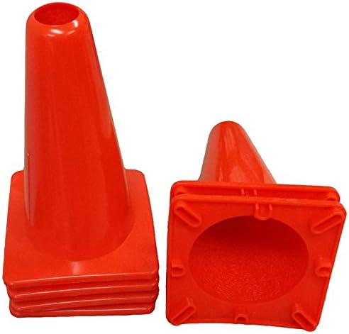 Bright orange weighted sports cone. Extremely durable and flexible; conforms to original shape if crushed. All sizes have a cut-out hole on the top. The top hole is not universal and may vary depending on cone size. Base design varies depending on size of the cone. See image for weight and base specifications.