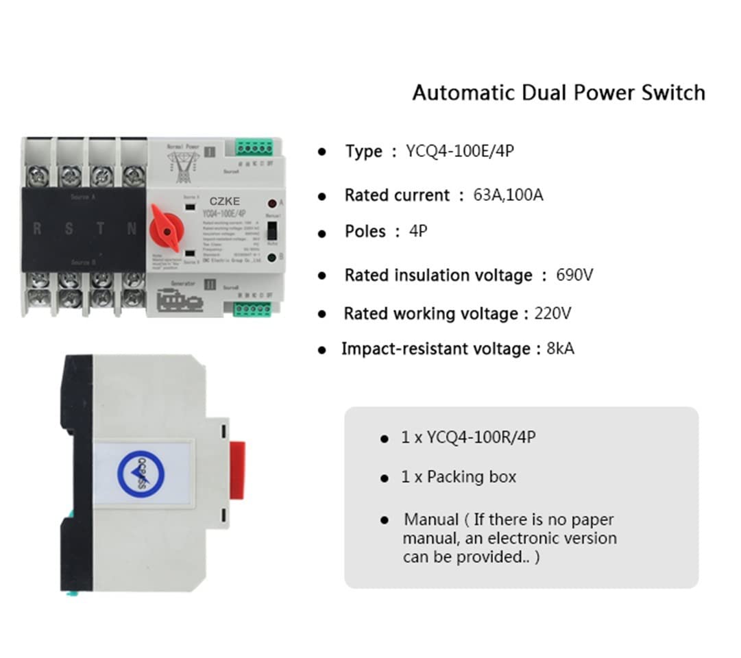 XIRIXX YCQ4-100E/4P 220V AC 8kA Din Rail ATS Switches Uninterrupted Power Dual Power Automatic Transfer Switch 63A 100A